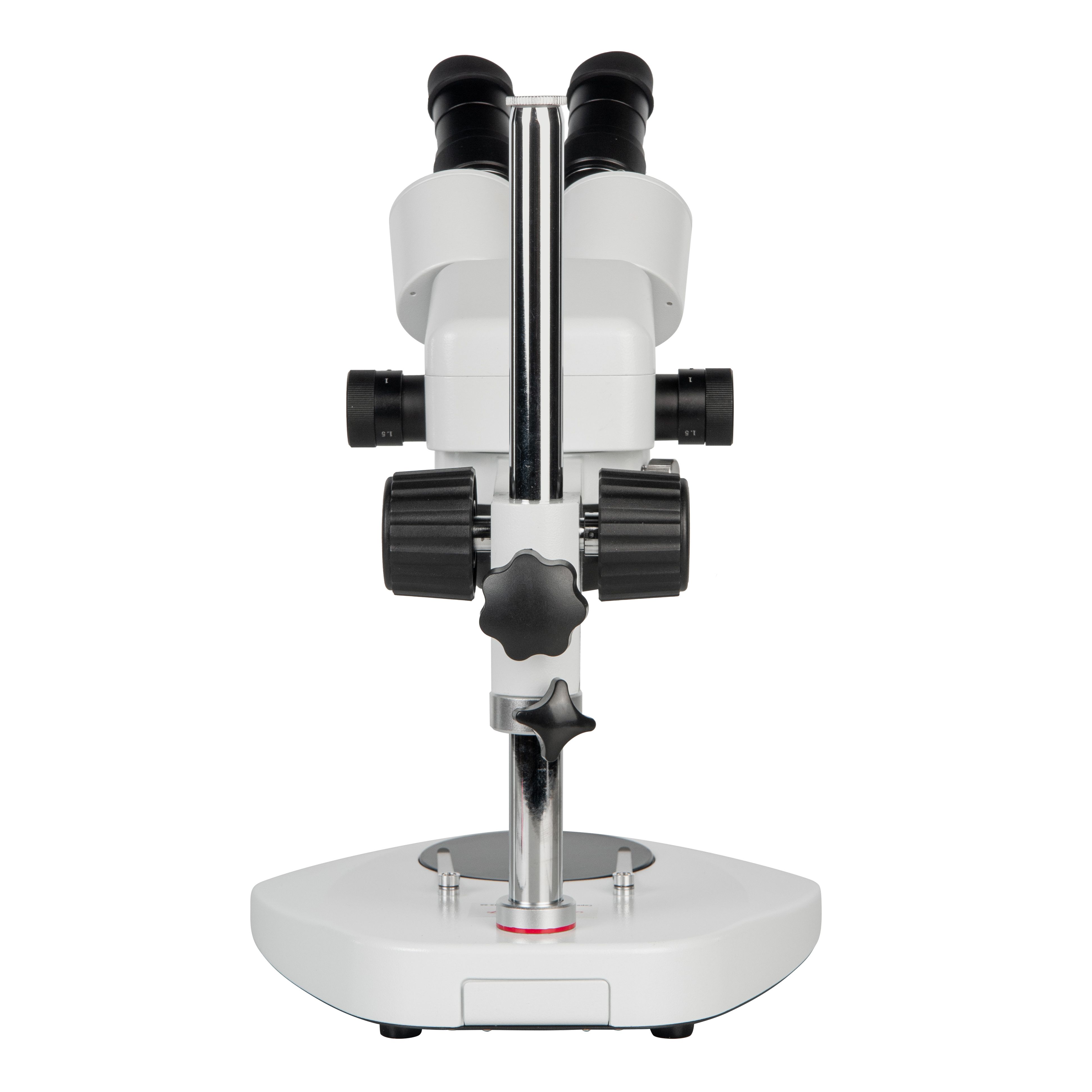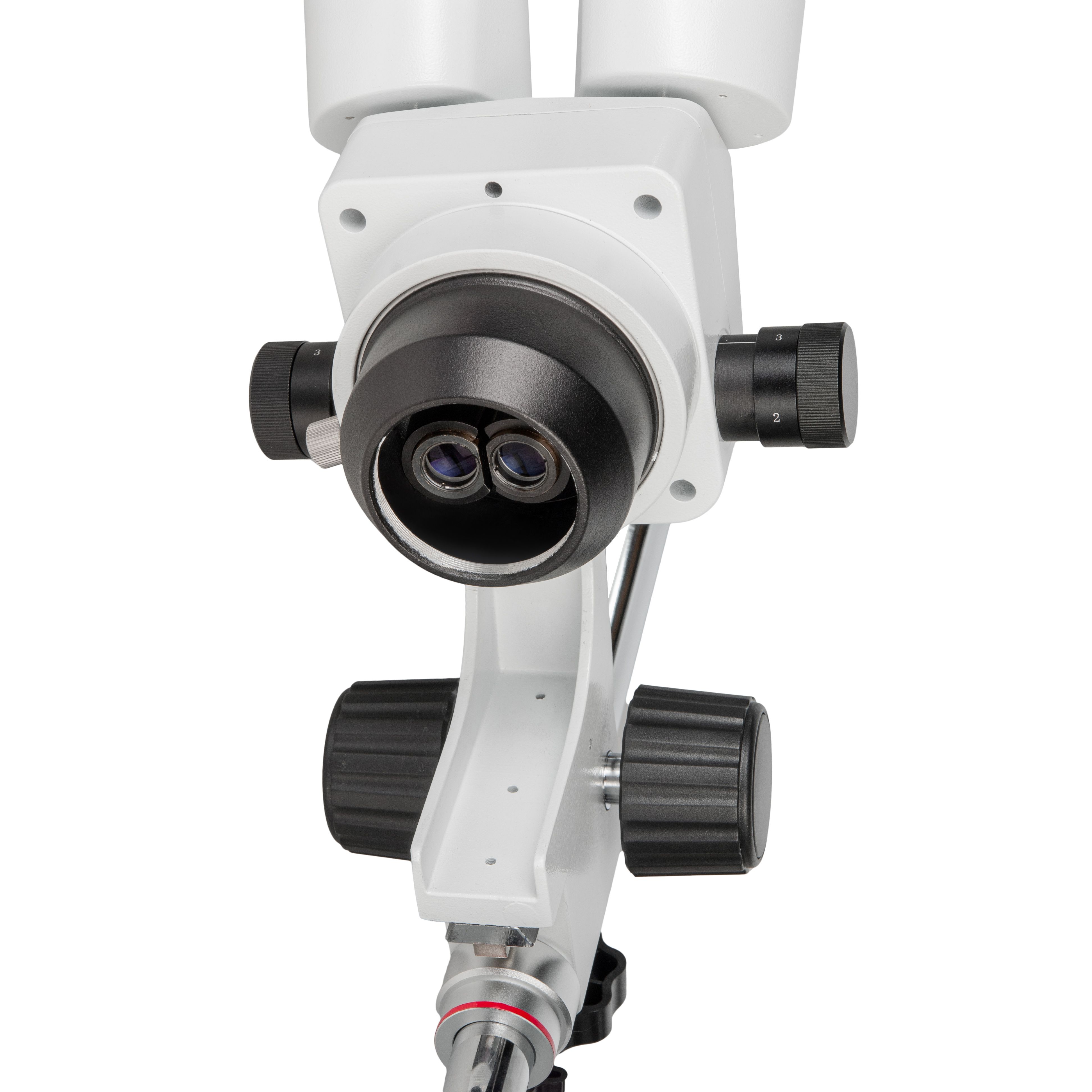 Бинокулярная визуальная насадка микроскопа снабжена окулярными тубусами с углом наклона 45⁰, каждый тубус имеет механизм диоптрийной коррекции ±5 дптр и снабжен стопорными винтами для предотвращения случайного выпадения окуляров. Межзрачковое расстояние настраивается в пределах от 55 до 75 мм. Возможность вращения в кольцевом держателе на 360° позволяет настраивать комфортное положение для наблюдений. Окулярная камера может быть установлена в любой окулярный тубус вместо окуляра.