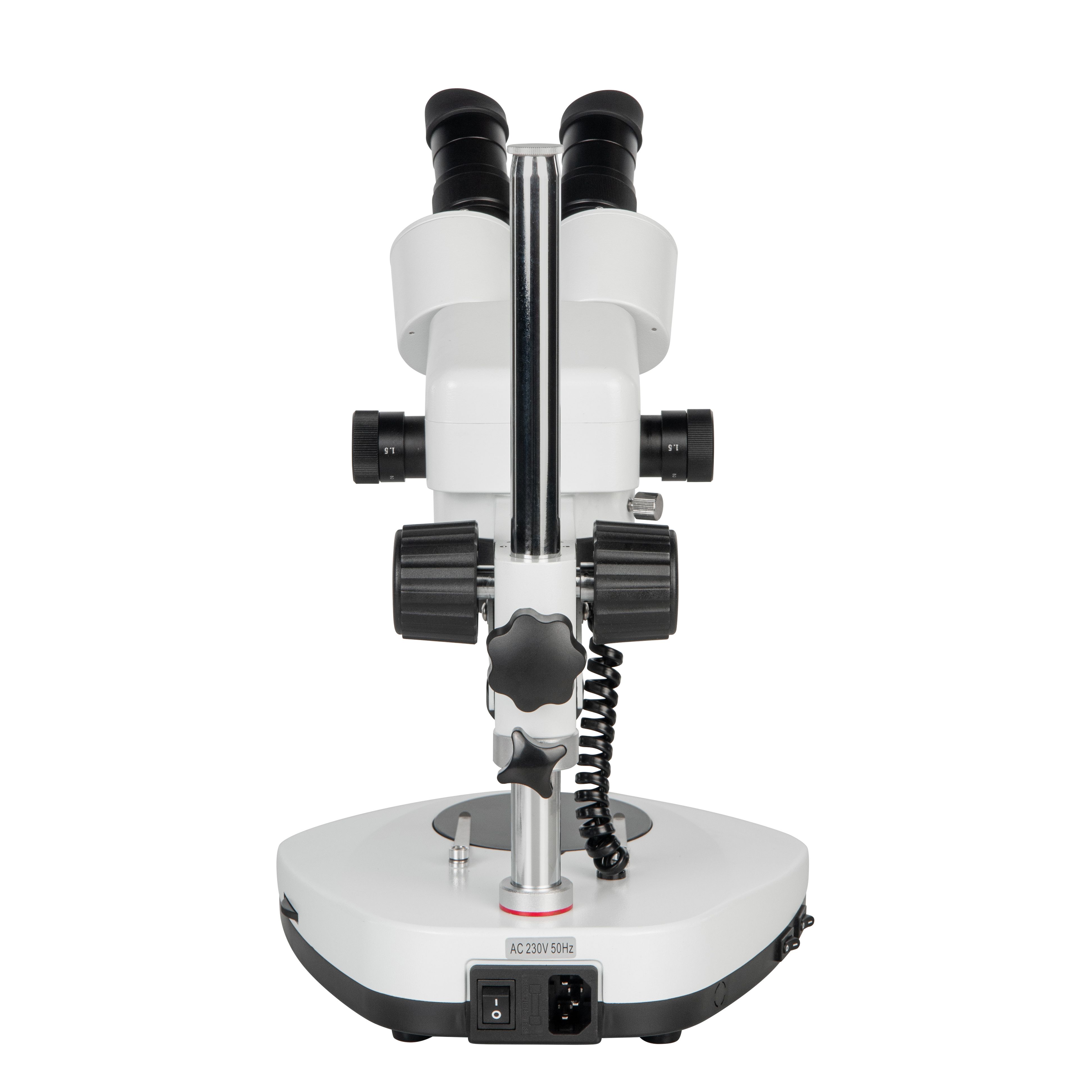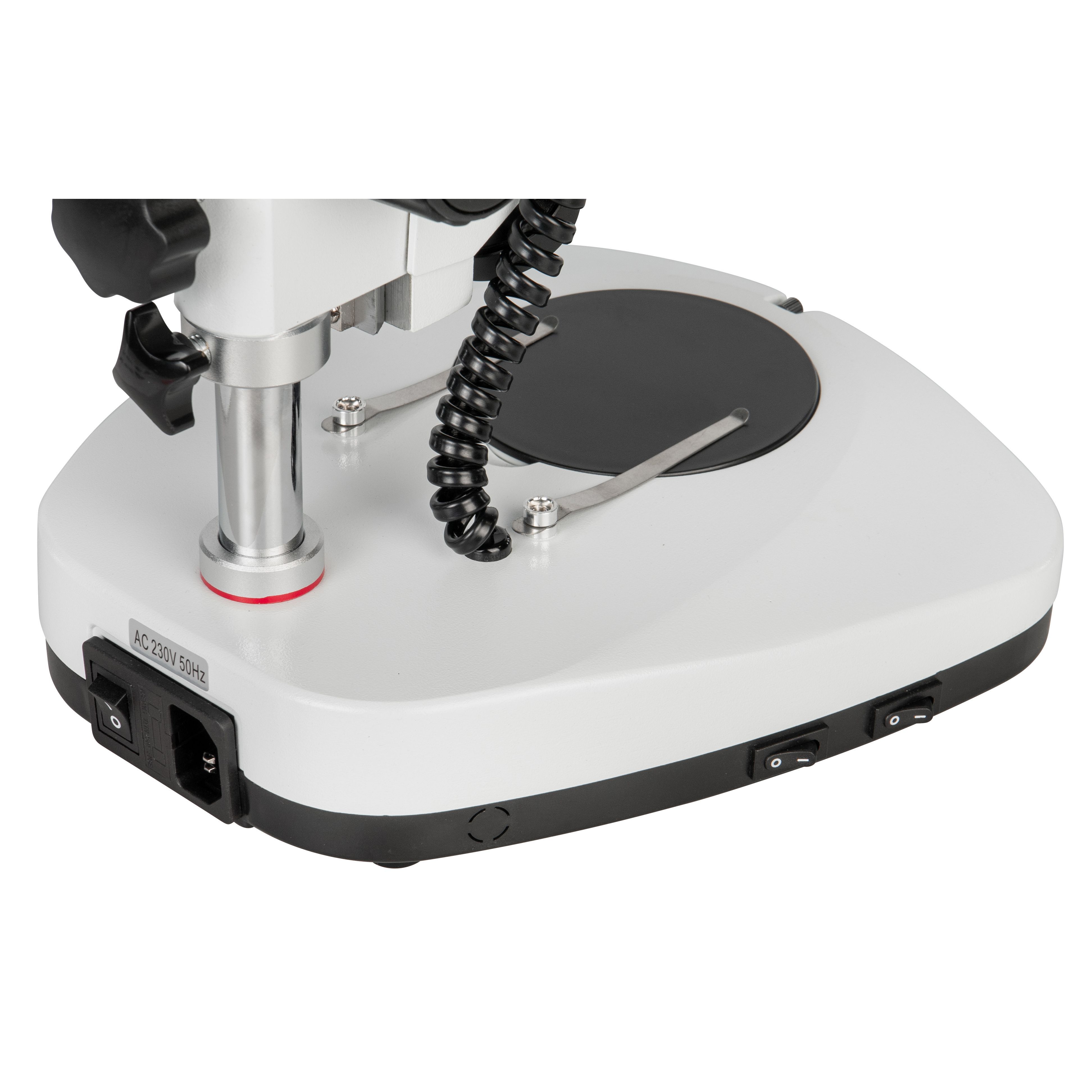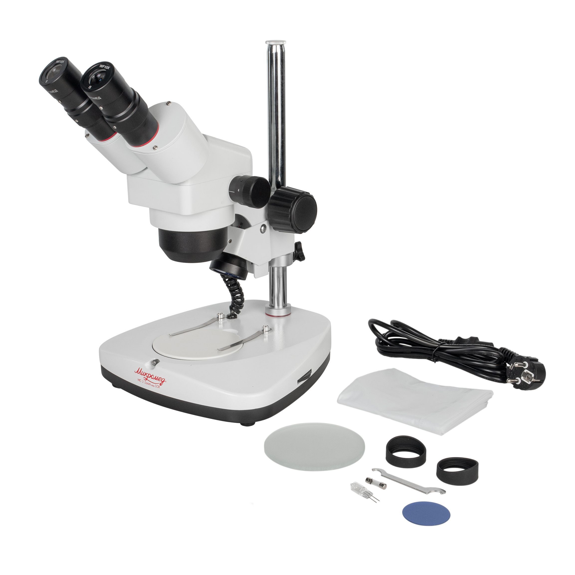 Бинокулярный стереомикроскоп с переменным увеличением 10х-40х в базовой комплектации. Постоянное рабочее расстояние 85 мм на всех значениях увеличений. Дополнительные оптические насадки. Встроенные осветители отраженного и проходящего света на галогенных лампах.