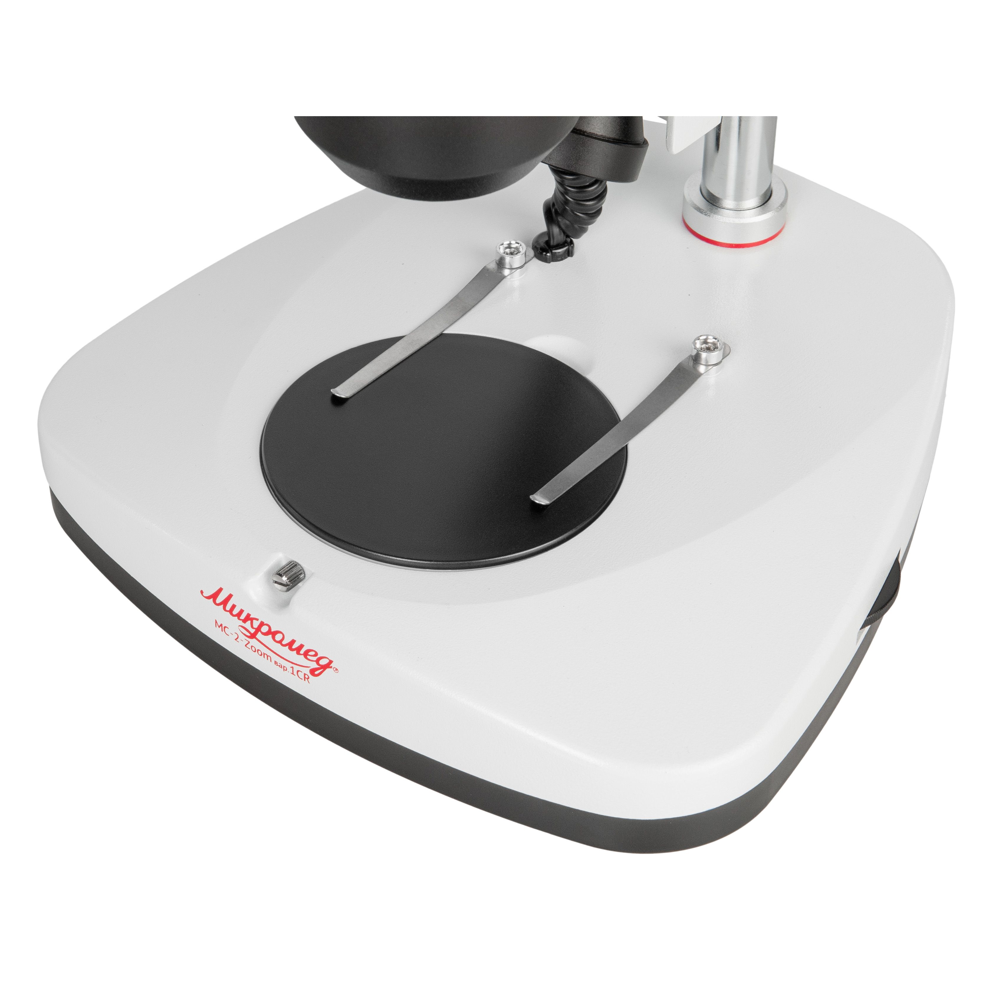 Для размещения объекта исследования в комплекте микроскопа имеются предметные вставки – полупрозрачная для проходящего света, двухсторонняя черная/белая для исследований в отраженном свете. Оба осветителя работают от блока постоянного тока встроенного в основание микроскопа и имеют плавную регулировку яркости.