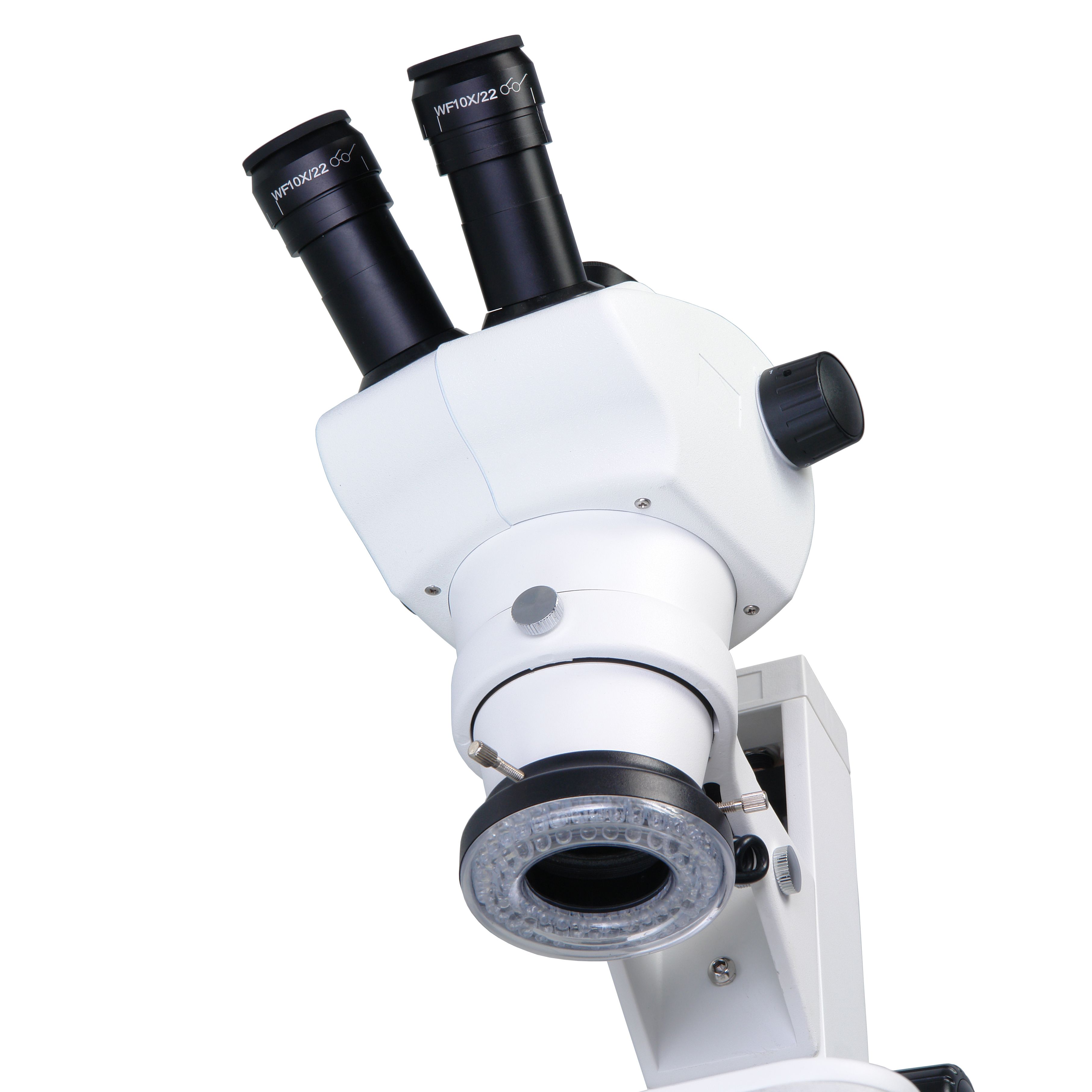 В комплекте микроскопа окуляры широкого поля WF10х/22 с вынесенным выходным зрачком. Также в комплекте окуляр WF10х/22 со шкалой, позволяющий проводить измерения линейных размеров и сравнивать размеры деталей объекта исследования. Каждый окуляр имеет механизм коррекции ±5 диоптрий. Общее увеличение микроскопа в базовой комплектации от 8х до 50х. Для микроскопа выпускаются окуляры WF 15х/16 и WF 20х/12 доступные по дополнительному заказу. С дополнительными окулярами максимальное увеличение микроскопа составляет 100х.