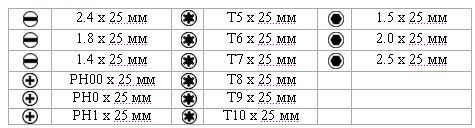 | Размеры Torx (T) | T5, T6, T8, T9, T10 |