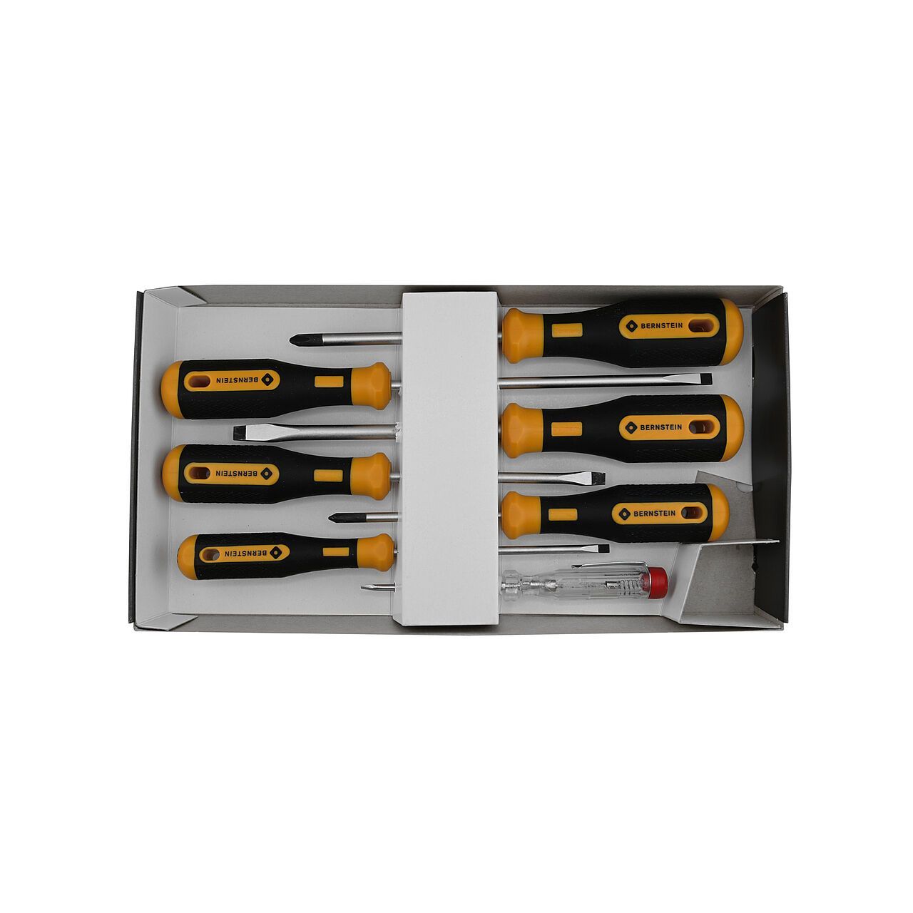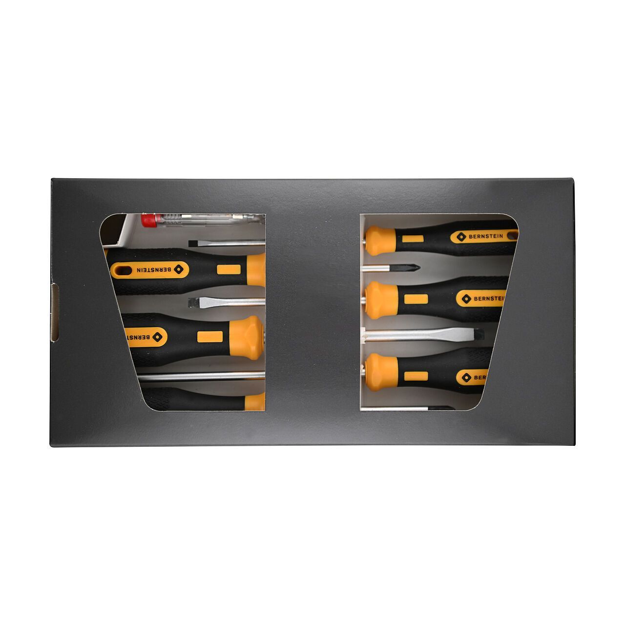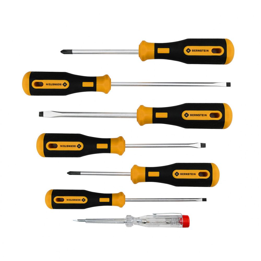 Bernstein B4-530 — набор из семи отвёрток EUROline-Power в картонной коробке для профессиональных и любительских работ в электронике и ремонте. Включает четыре шлицевые и две крестовые отвёртки, а также тестер напряжения. Лезвия из хромованадиевой молибденовой стали (HRC 56–58) с матовым хромированным покрытием и заточенными кончиками обеспечивают точный захват и предотвращают сколы. Двухкомпонентные эргономичные рукоятки с нескользящим покрытием и отверстием для подвешивания минимизируют утомляемость.