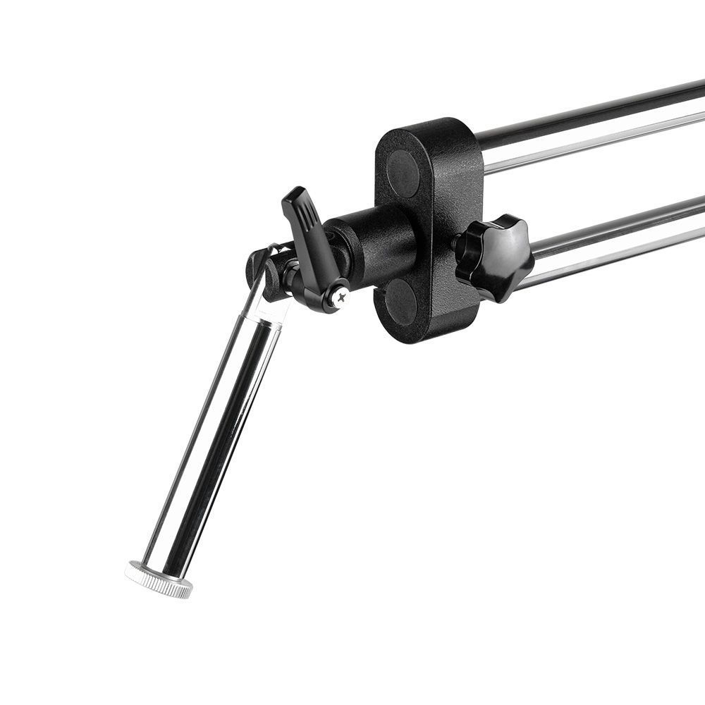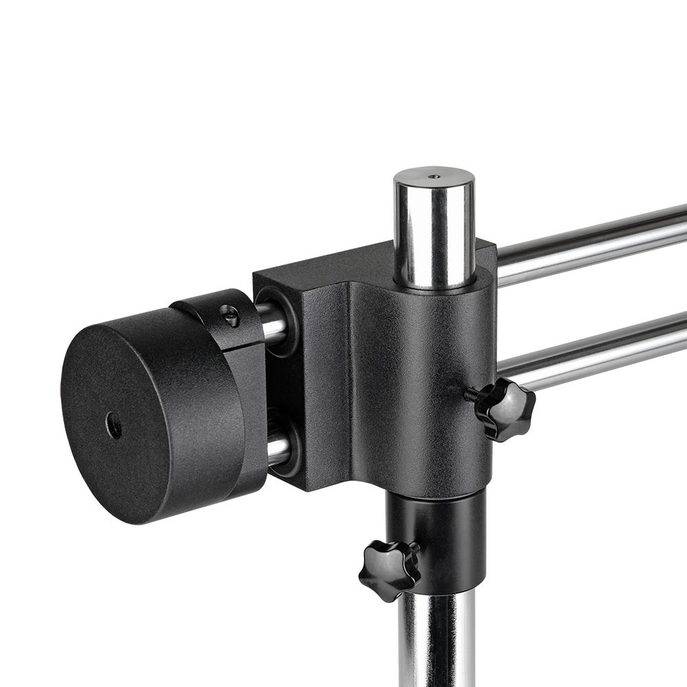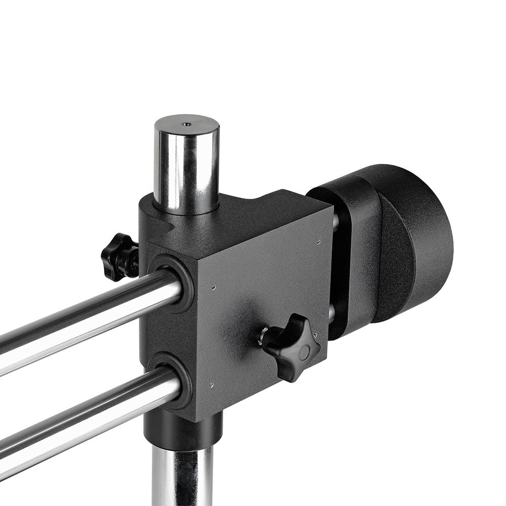 Штатив обеспечивает значительную величину выноса головки – расстояние от оптической оси до вертикальной штанги составляет до 560 мм, что позволяет исследовать габаритные объекты с размерами до 1000 мм. Конструкция с параллельными штангами снабжена противовесом, это обеспечивают точность горизонтального перемещения и стабильность штатива с головкой.