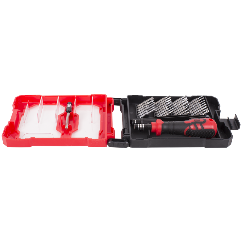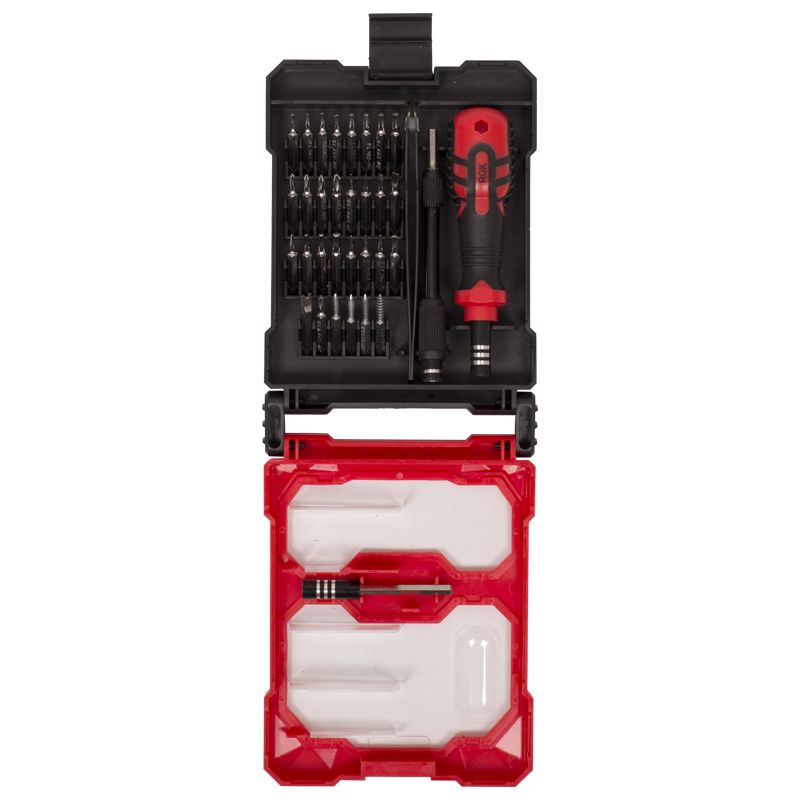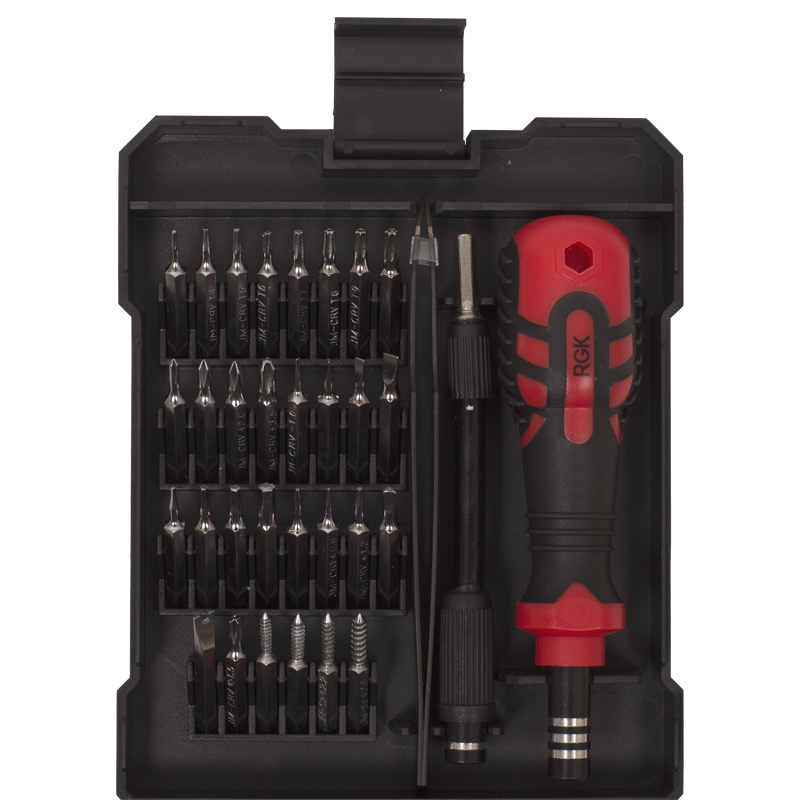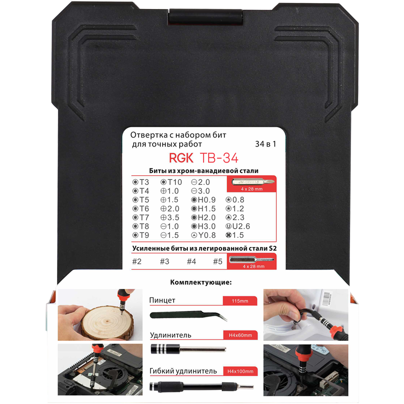 Отвертка RGK TB-34 поставляется с комплектом из 30 насадок различных типоразмеров, которые подойдут для обслуживания компьютерной техники, смартфонов, электроники, радиоприборов и часовых механизмов. Металлический пинцет поможет извлечь винты и другие мелкие предметы из труднодоступных мест.