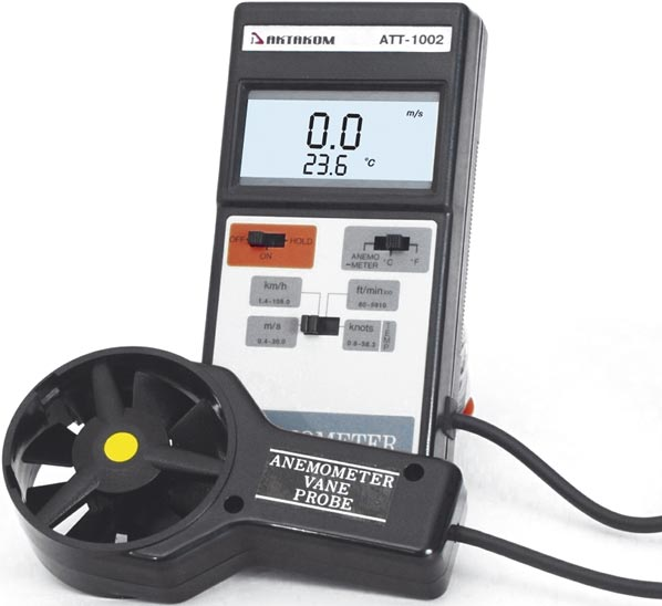В приборе использован выносной датчик (крыльчатка), снабженный подвеской на шарикоподшипниках с малым трением и обеспечивающий быстрое и точное дистанционное измерение скорости воздушного потока, его температуры и мгновенную индикацию на ЖК-дисплее.