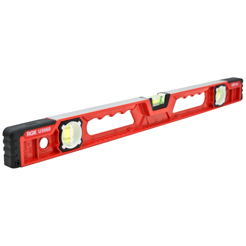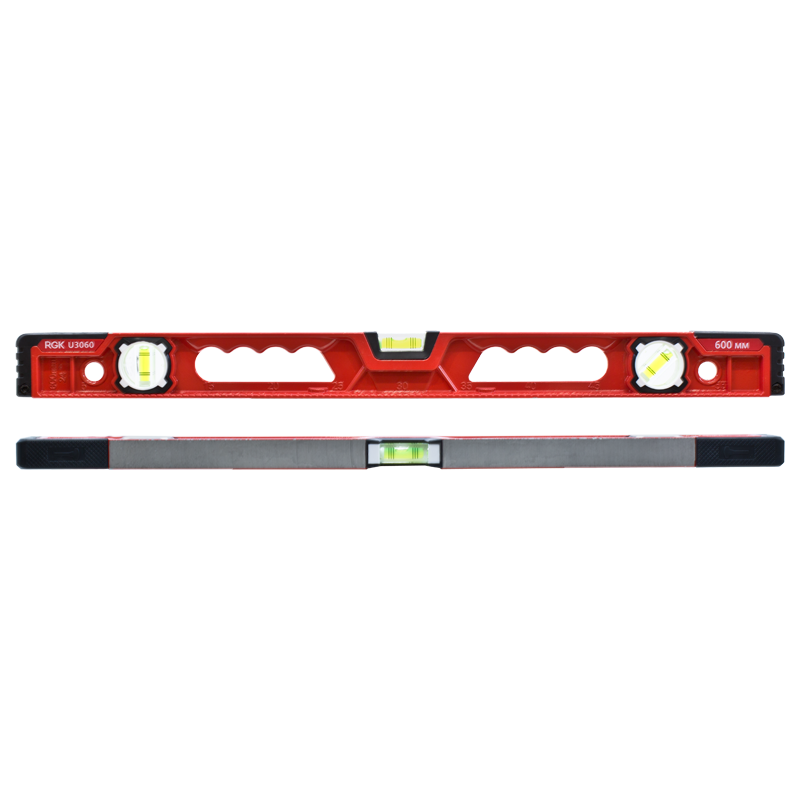 Уровень RGK U3060 длиной 60 сантиметров выполнен в прочном металлическом корпусе из литого профиля с резиновыми насадками, поэтому вы можете выравнивать поверхность ударами молотка непосредственно по уровню.