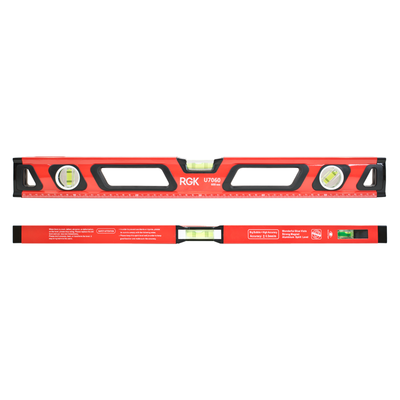 Магнитный уровень RGK U7060 длиной 60 сантиметров оснащен магнитом для крепления на металлических поверхностях, чтобы освободить руки при проведении разметки. Специальное смотровое окошко на узком ребре покажет положение пузырька вертикального уровня при измерениях в труднодоступных местах.