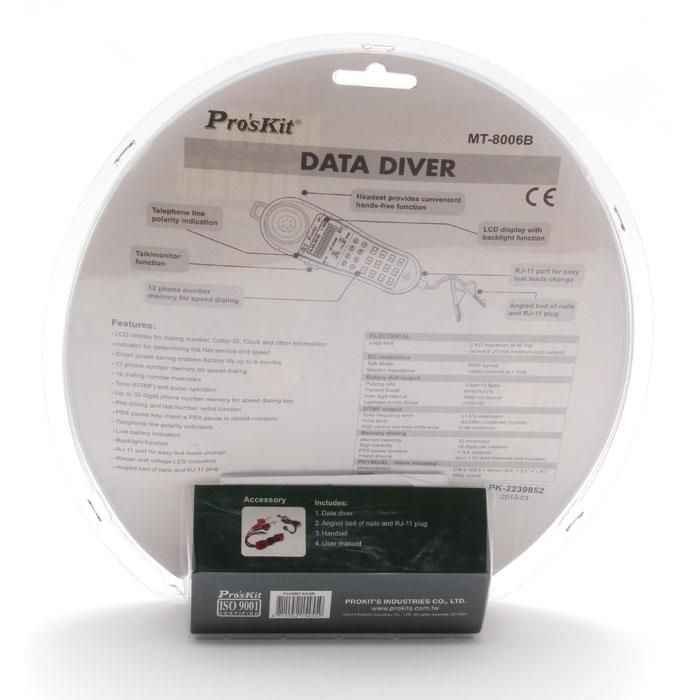 ProsKit MT-8006B позволяет проверять состояние линии, измерять сопротивление, использовать дисковый и тональный набор, а также сохранять до 12 номеров в памяти для быстрого набора.