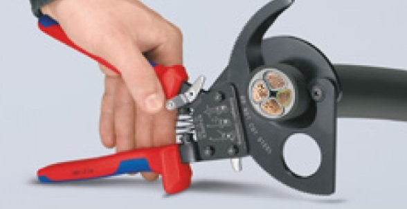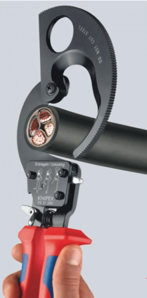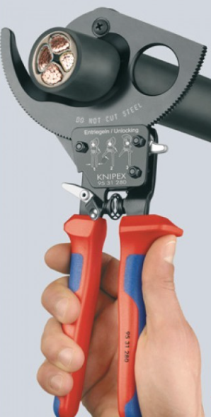 KNIPEX KN-9531250 секторные ножницы с храповым механизмом предназначены для резки медных, алюминиевых, одножильных и многожильных кабелей.