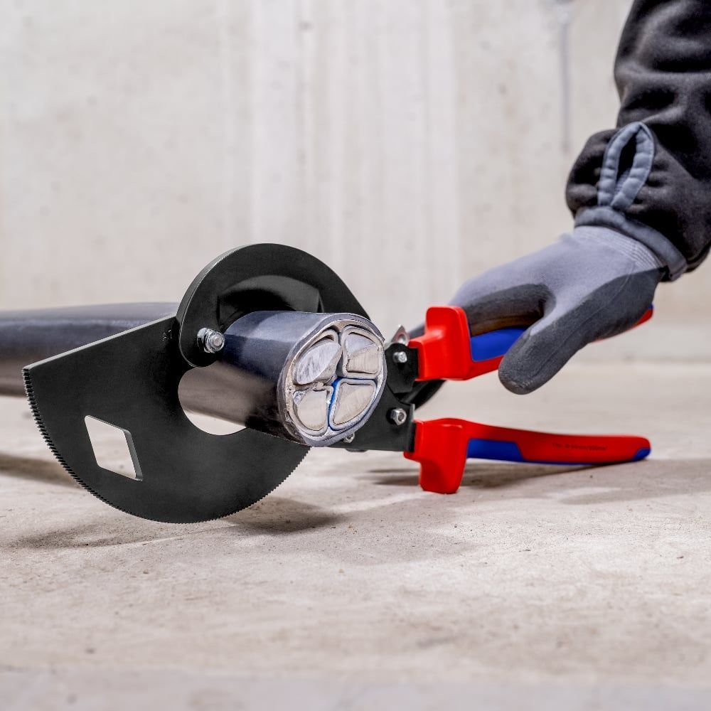 KNIPEX KN-9532320 секторные ножницы с храповым механизмом предназначены для резки медных, алюминиевых, одножильных и многожильных кабелей.