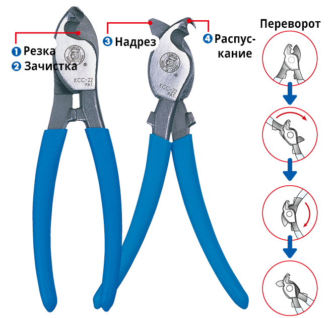 Ножницы кабельные комбинированные Tsunoda KCC-22 из серии KingTTC — это профессиональный многофункциональный инструмент (162 мм) с отличной эргономикой. Благодаря уникальному инверсивному механизму, он совмещает в себе функции резки, зачистки, надреза и распускания кабеля, что делает его незаменимым в электромонтажных работах.
