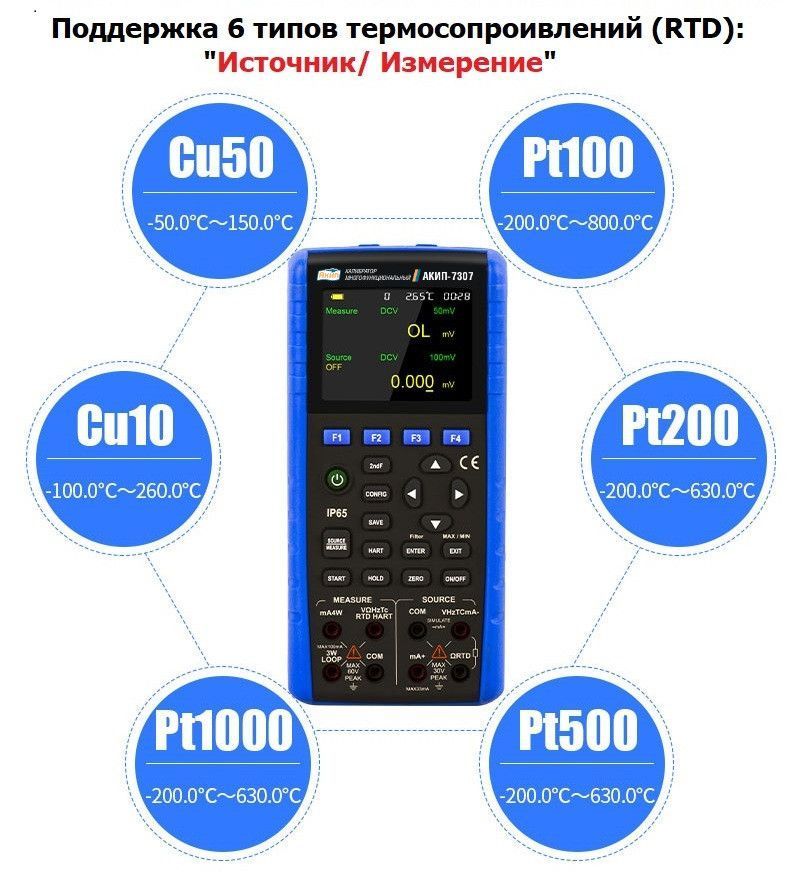 | Диапазон температур «термосопротивления» (имитация) | -200 … +800 °C (PT100, PT200, PT500, PT1000, Cu10, Cu50) |