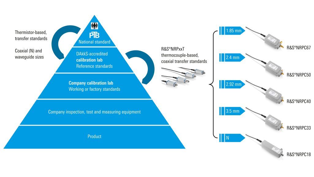 Пять модульных комплектов для калибровки R&S®NRPC используются для калибровки датчиков мощности R&S®NRP и других устройств для достижения высокого уровня точности. После калибровки датчики работают в рамках указанных погрешностей калибровки и, как правило, остаются на уровне ниже этих значений. Каждый комплект для калибровки включает в себя высокоточный стандарт мощности, который можно отслеживать по основным стандартам мощности Physikalisch-Technische Bundesanstalt (PTB, Национального института метрологии Германии) посредством калибровки, аккредитованной Deutsche Akkreditierungsstelle (DAkkS, Национальным органом по аккредитации Германии).