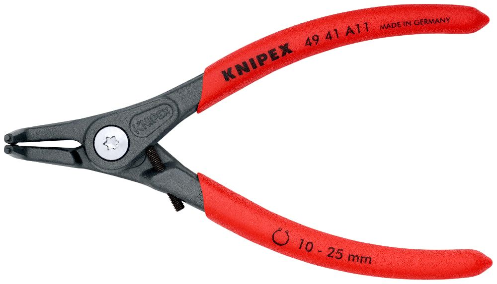KNIPEX KN-4941A11 прецизионные щипцы с ограничением раскрытия, предназначены для монтажа стопорных колец. Эргономичные изогнутые ручки с пластмассовыми чехлами удобно лежат в руке и не скользят.