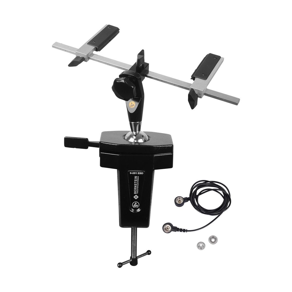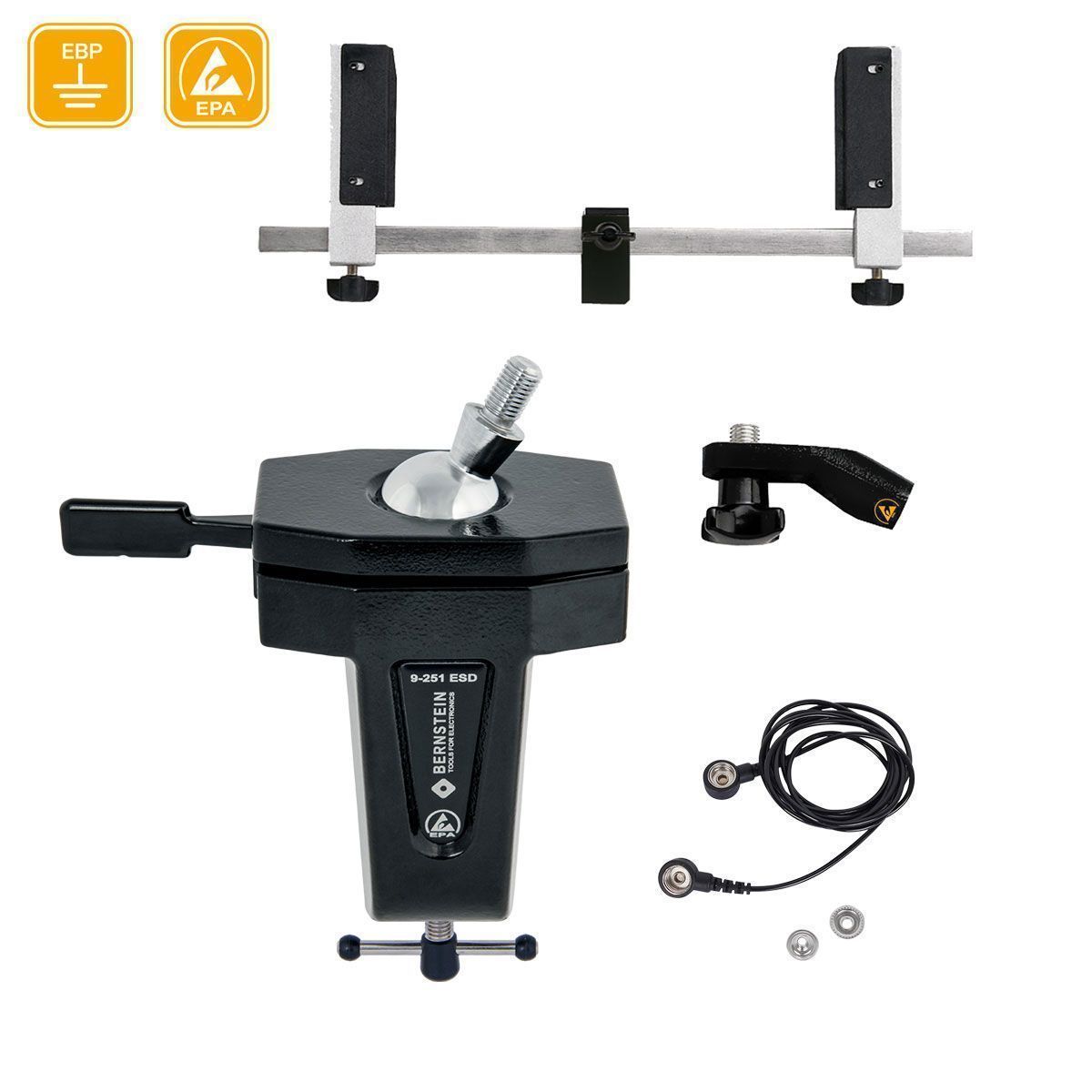 Bernstein B9-240-ESD (SPANNFIX VARIO) — это профессиональный антистатический держатель печатных плат с шаровым шарниром, разработанный для высокоточных работ в зонах, защищенных от электростатических разрядов (ESD). Система оснащена регулируемой монтажной рамой и угловым адаптером, что позволяет фиксировать платы длиной до 270 мм в любом удобном положении для максимально эффективной пайки и сборки.