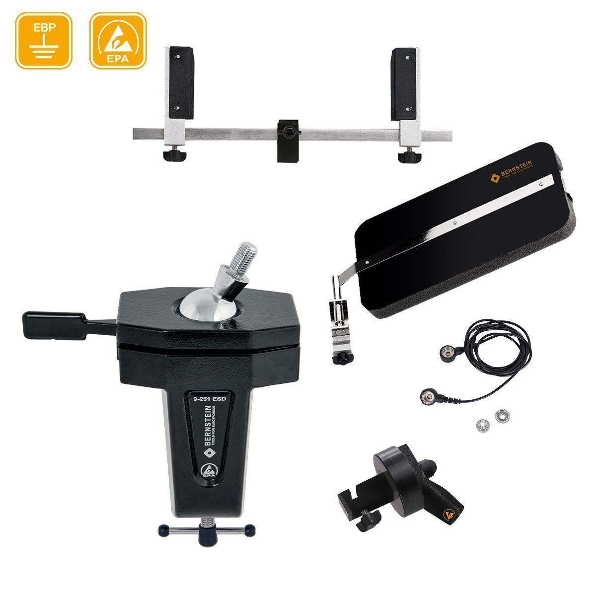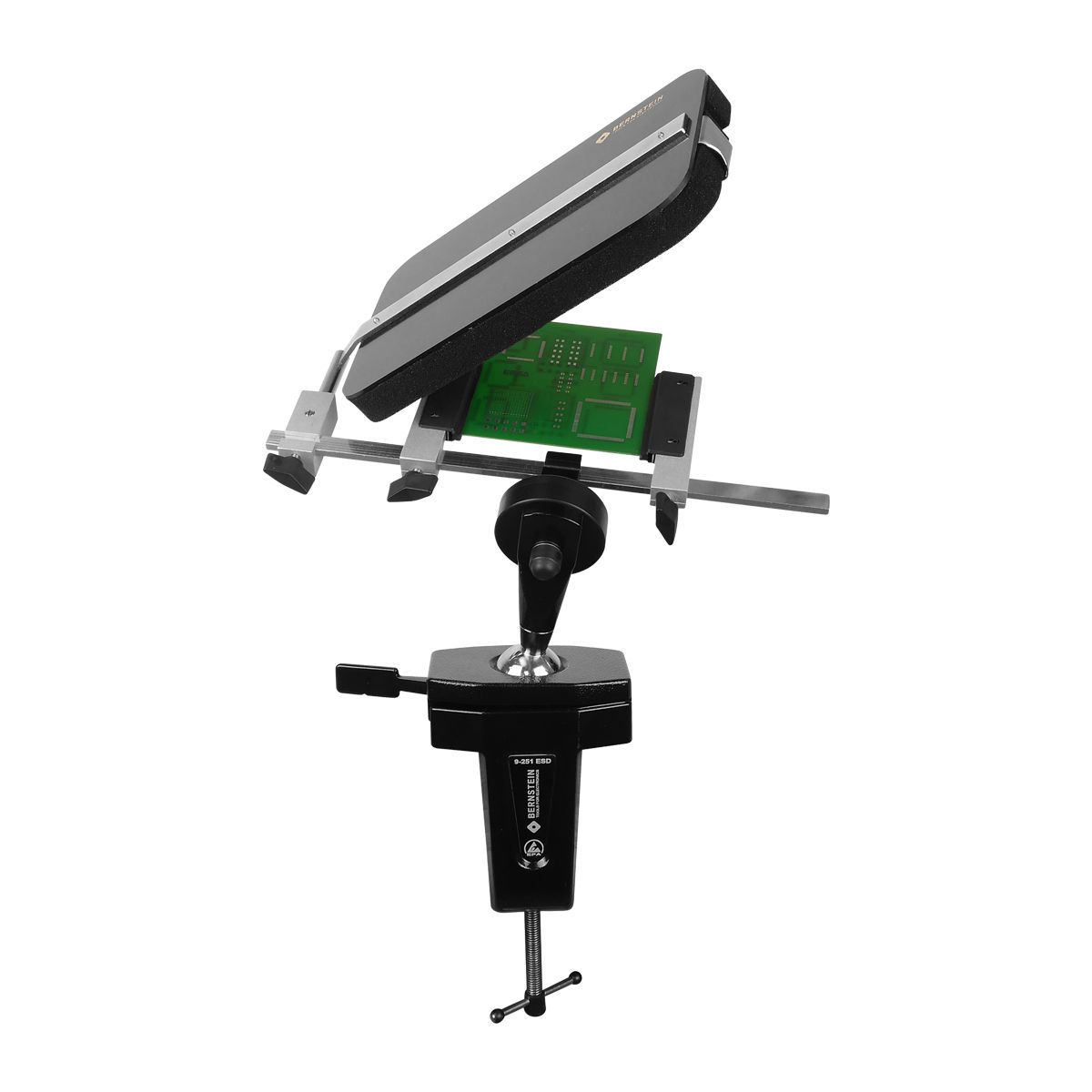 Bernstein B9-270-ESD (SPANNFIX VARIO PLUS) — Антистатические тиски с держателем для печатных плат. Система дополнена быстроразъемным устройством и переходной пластиной, что в сочетании с прецизионным шаровым шарниром позволяет мгновенно менять положение плат длиной до 270 мм для максимально комфортной пайки и сборки сложных электронных модулей.