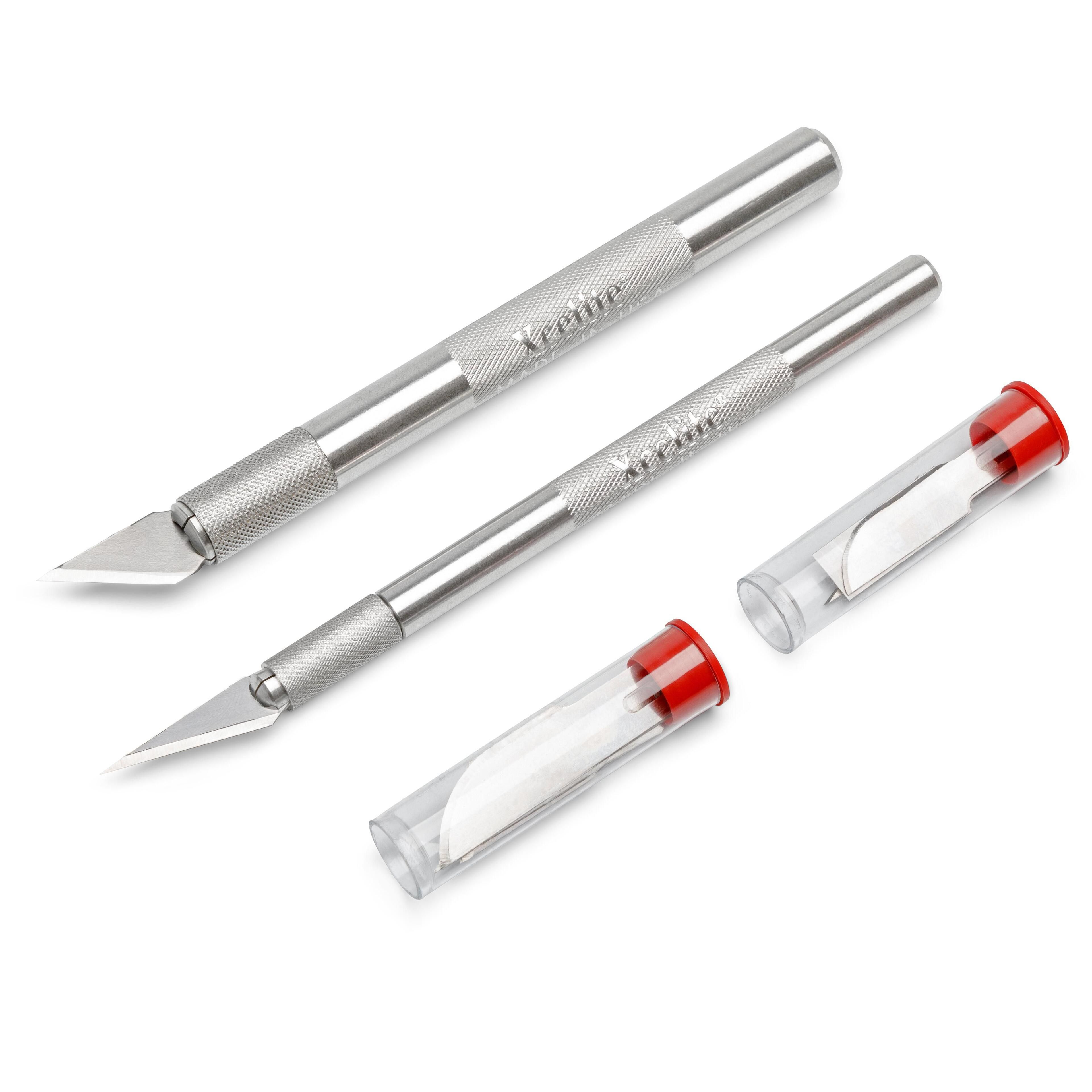 Комплект включает два ножа и десять сменных лезвий, поставляется в компактном кейсе для удобного хранения и транспортировки.