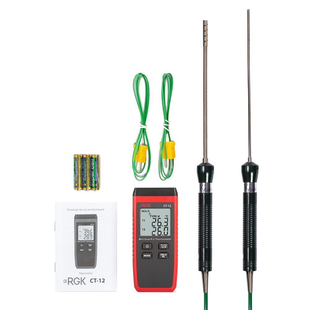 Контактный термометр RGK CT-12 с зондом температуры воздуха TR-10A и погружным зондом температуры TR-10W - это надежный и точный прибор для измерения температуры в диапазоне от -40°С до +400°С с комплектной термопарой. Погрешность при этом составляет не более ± 1,5 °C. Главное преимущество этой модели - 2 гнезда для подключения выносных датчиков с функцией определения разности между каналами. Благодаря такой конфигурации можно быстро и удобно решать множество измерительных задач, связанных с диагностикой и настройкой электроники, промышленного оборудования, систем отопления и вентиляции т.п.
