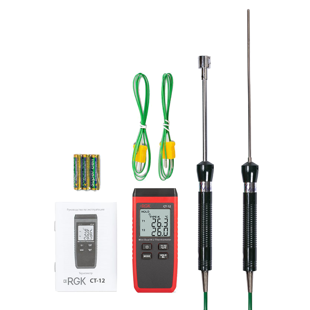 За счет небольшого веса компактный двухканальный цифровой термометр RGK CT-12 с погружным зондом температуры TR-10W и поверхностным зондом TR-10S удобен для проведения длительных инспекций в полевых условиях, легко помещается в карман одежды или сумки. С большого дисплея показания считываются легко и без путаницы между каналами. Корпус прибора выполнен из прочного пластика, снабжен рельефными участками для надежного захвата и выдерживает падение с метровой высоты.