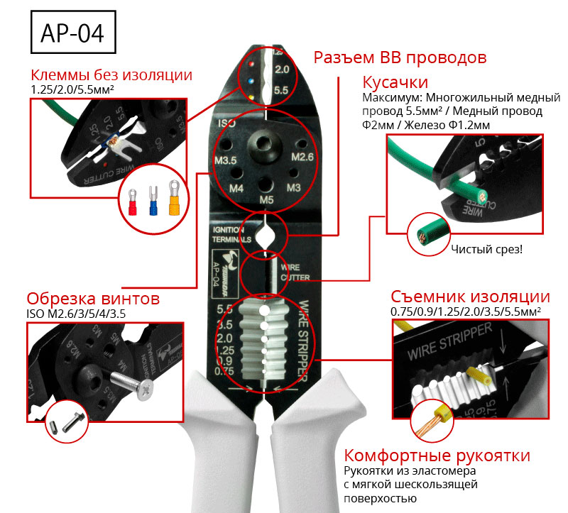 Клещи кабельные многофункциональные Tsunoda AP-04 из серии KingTTC — это профессиональный инструмент (223 мм) для электриков, объединяющий пять ключевых функций в одном изделии. Клещи предназначены для обжима клемм с изоляцией и разъемов высоковольтных проводов, резки провода, снятия изоляции, а также имеют секции для обрезки монтажных винтов.