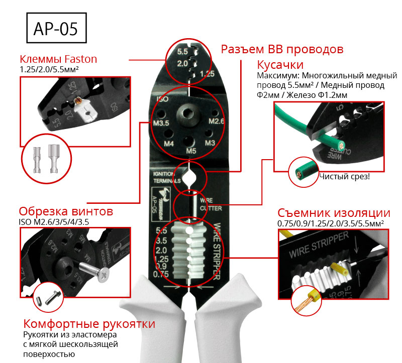 Клещи кабельные многофункциональные Tsunoda AP-05 из серии KingTTC — это профессиональный инструмент (223 мм) для электриков, объединяющий пять ключевых функций в одном изделии. Клещи предназначены для обжима клемм Faston и разъемов высоковольтных проводов, резки провода, снятия изоляции, а также имеют секции для обрезки монтажных винтов.