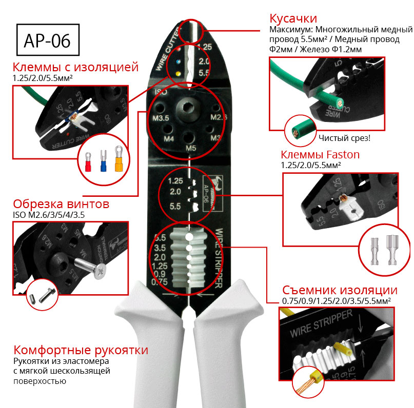 | Снятие изоляции | 0.75 / 0.9 / 1.25 / 2.0 / 3.5 / 5.5 мм² (AWG 18/17/16/14/12/10) |
