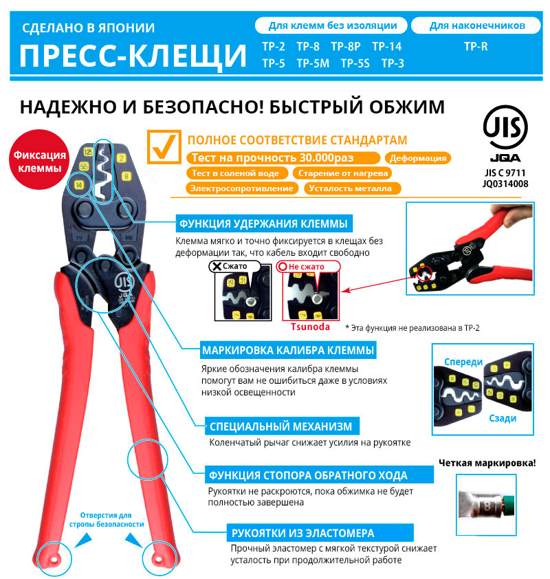 Пресс-клещи Tsunoda TP-2 — это высококачественный специализированный инструмент (168 мм) с компактной головкой. Предназначены для точного и надежного обжима клемм малого и среднего сечения. Оснащены коленчатым шарниром для снижения усилий на рукоятках и комфортными эластомерными рукоятками.