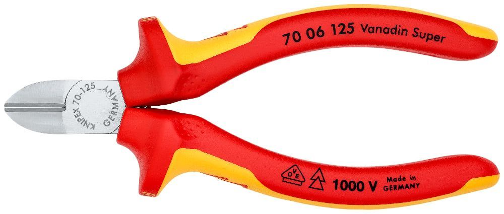 KNIPEX KN-7006125 диэлектрические бокорезы диагонального типа для резки жёсткого провода. Подходят для требующих высокой точности и аккуратности работ в сфере электроники.