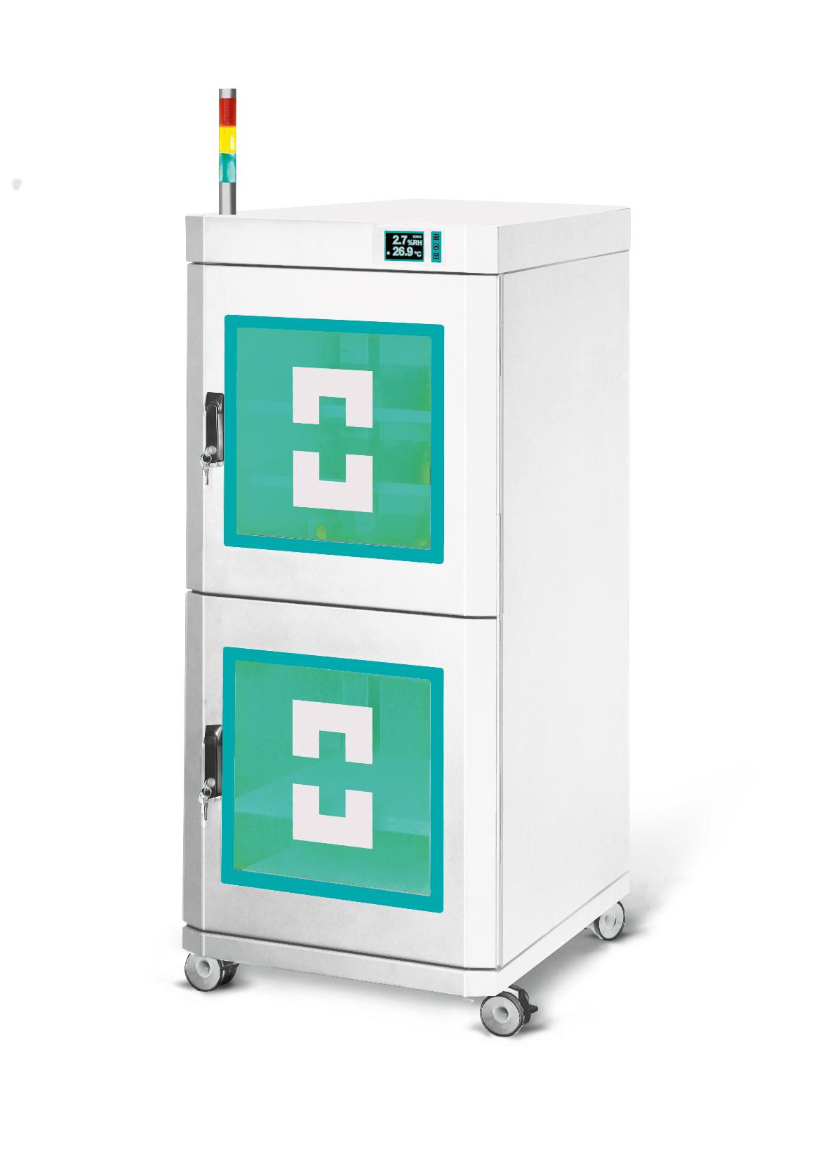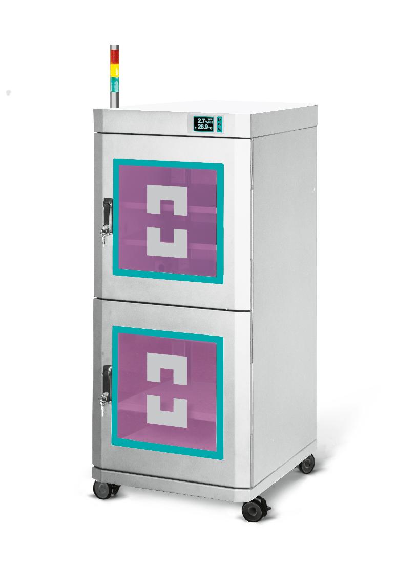 Компактная модель из двух секций. Для мобильности установлена на поворотные антистатические колеса. В базовой комплектации оснащена цветным ЖК-дисплеем, панелью управления и разъемом RS-232 для управления с ПК. В основе – связка из современного микропроцессора и калиброванного CMOS-датчика. Для защиты содержимого полки заземлены на каркас, стальные детали покрыты антистатическим покрытием, в дверцы установлены стекла с токопроводящей поверхностью.