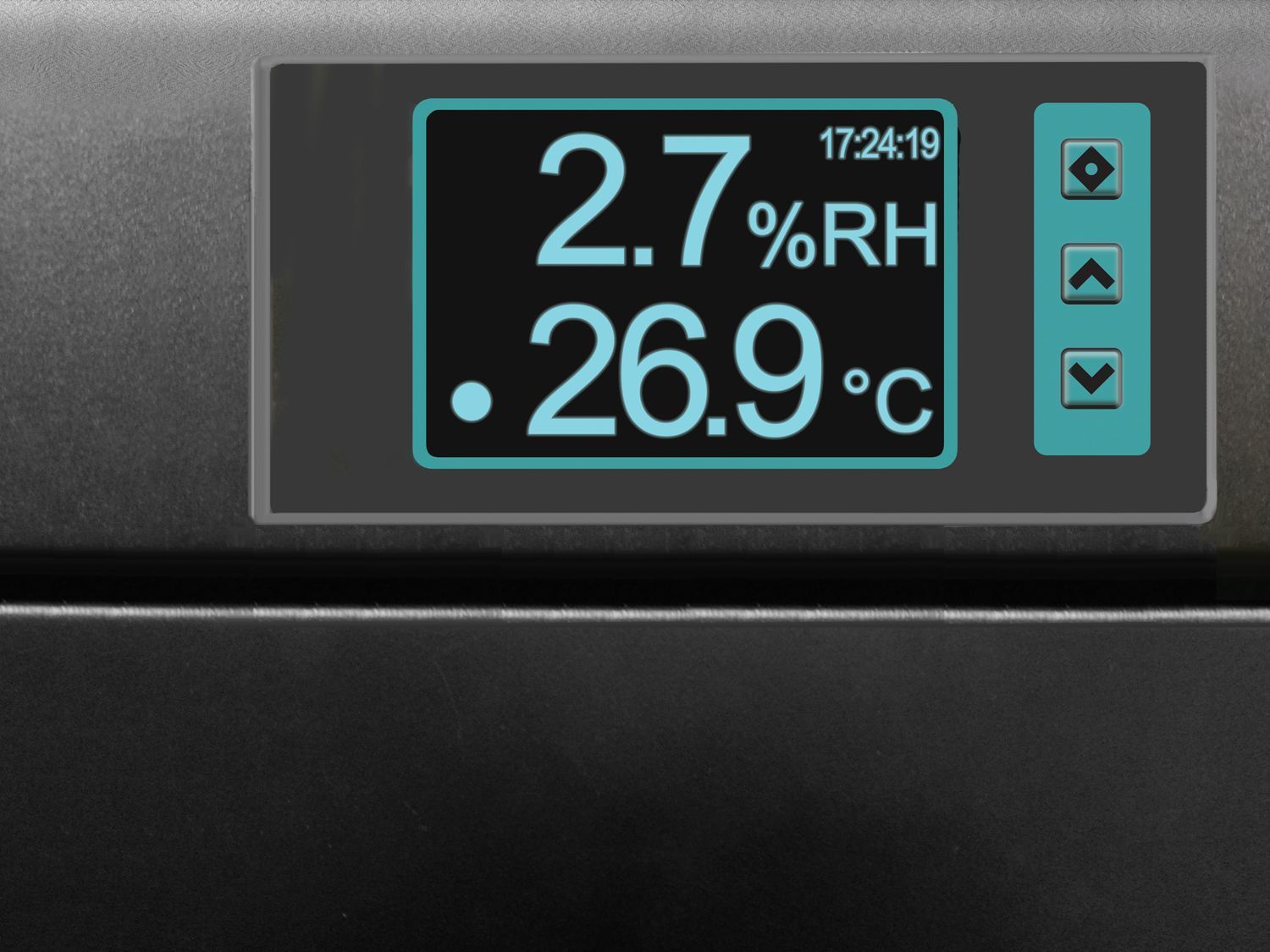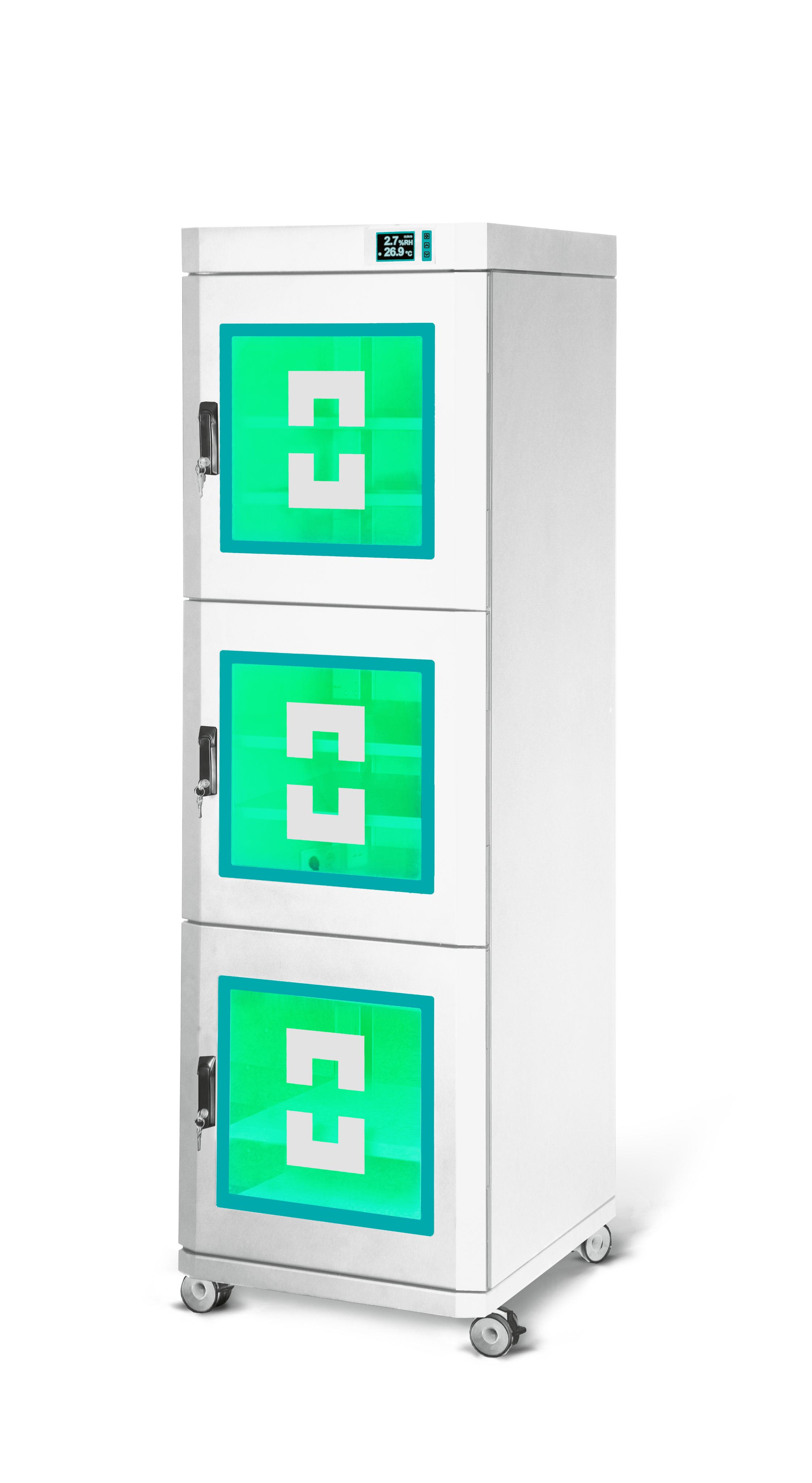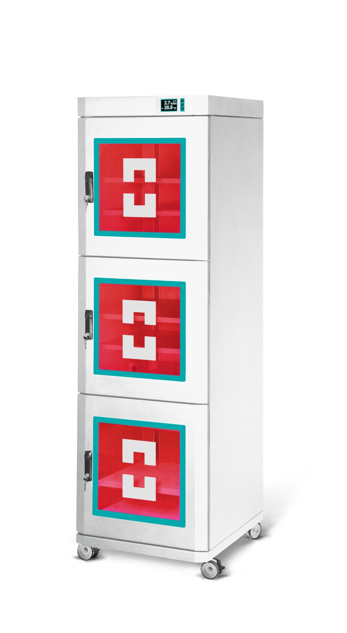 В стандартной комплектации шкаф оснащен тремя отделениями с независимыми замками, индикаторами температуры и влажности в камере и четырьмя антистатическими поворотными колесами.