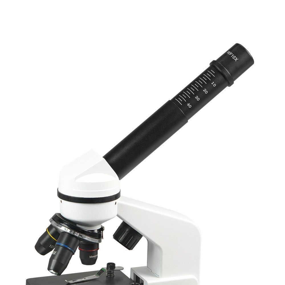 Увеличение микроскопа от 40х до 800х, максимальная величина 800х достигается благодаря входящему в комплект объективу 40х и линзе Барлоу 2х. Линзу можно сдвигать вдоль оптической оси окулярного тубуса, плавно изменяя тем самым увеличение. Оправа линзы имеет шкалу для установки необходимых значений увеличения. Использование линзы Барлоу приводит к уменьшению поля зрения и падению яркости наблюдаемого изображения. При необходимости получать малые увеличения от 20х, к микроскопу можно приобрести дополнительный окуляр WF 5х с посадочным диаметром 23.2 мм. Линзу Барлоу в этом случае необходимо удалить.