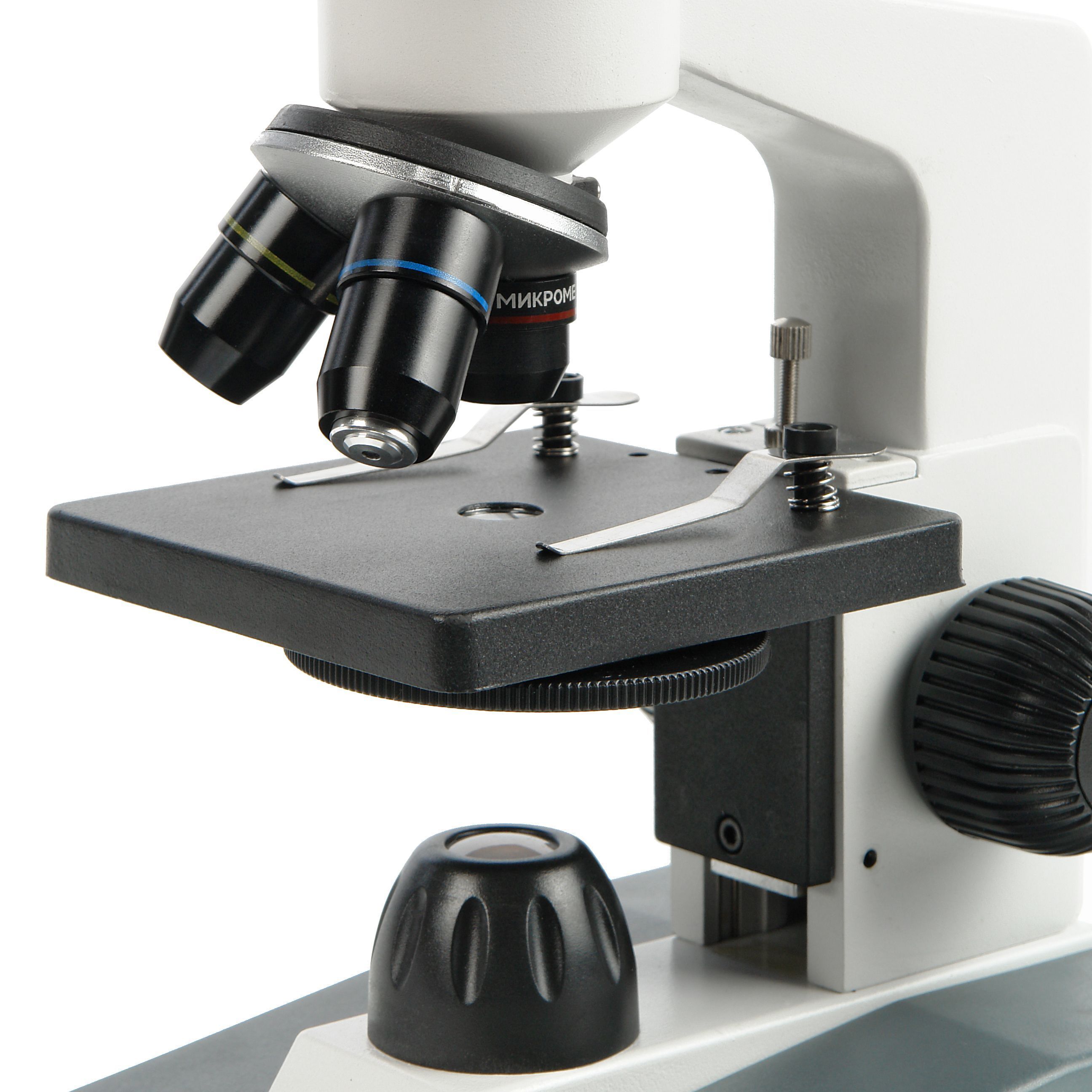 Фокусировка микроскопа осуществляется перемещением по вертикали предметного столика. В механизме использована зубчато-реечная передача, все ее детали изготовлены из металла. Механизм обеспечивает точное перемещение предметного столика без люфтов. Для предотвращения повреждения исследуемого образца и объектива предусмотрен винтовой ограничитель перемещения. Предметный столик микроскопа имеет размеры 95 х 95 мм и снабжен пружинными клипсами для фиксации исследуемого образца.