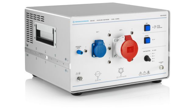 Четырехпроводный V-образный эквивалент сети питания R&S®ENV432 соответствует требованиям CISPR 16‑1‑2, EN 55016-1-2 и ANSI C63.4 для V-образных сетей с имитируемым импедансом (50 мкГн + 5 Ом) || 50 Ом в диапазоне частот от 9 кГц до 30 МГц. R&S®ENV432 поставляется с гнездом Schuko (EUT 1) и гнездом CEE 32 A (EUT 2) для подключения испытываемого оборудования (EUT). Фазу V-образной сети можно выбрать вручную переключателем на передней панели или автоматически через управляющие входы TTL, совместимые с новейшими измерительными приемниками Rohde & Schwarz.
