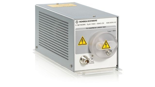 Однопроводной V-образный эквивалент сети питания R&S®ESH3-Z6 с имитированным импедансом 5 мкГн || 50 Ом согласно CISPR 25/EN 55025, а также DEF-STAN 59-411 и DO-160 в диапазоне частот от 100 кГц до 200 МГц. В MIL-STD-461 это альтернатива для меньших платформ (распределение питания менее чем на 50 м), таких как истребители. Устройство R&S®ESH3-Z6 способно работать с непрерывным током до 100 А и может выдерживать импульсы тока до 500 А в течение не более 30 с.