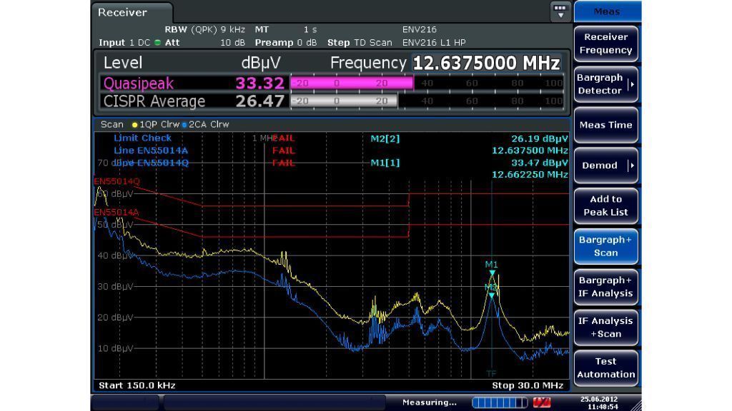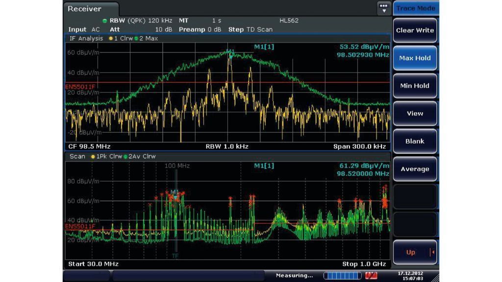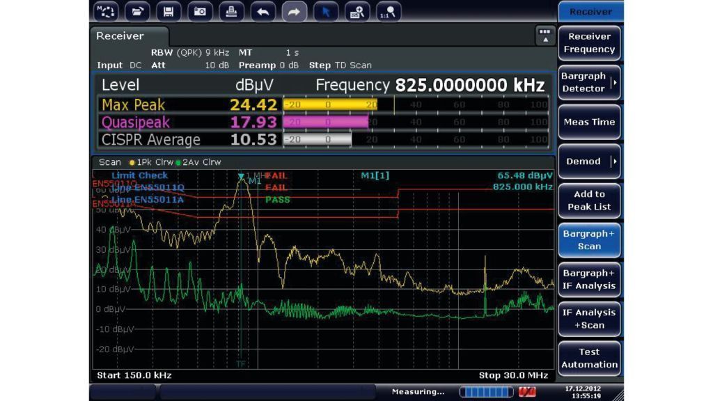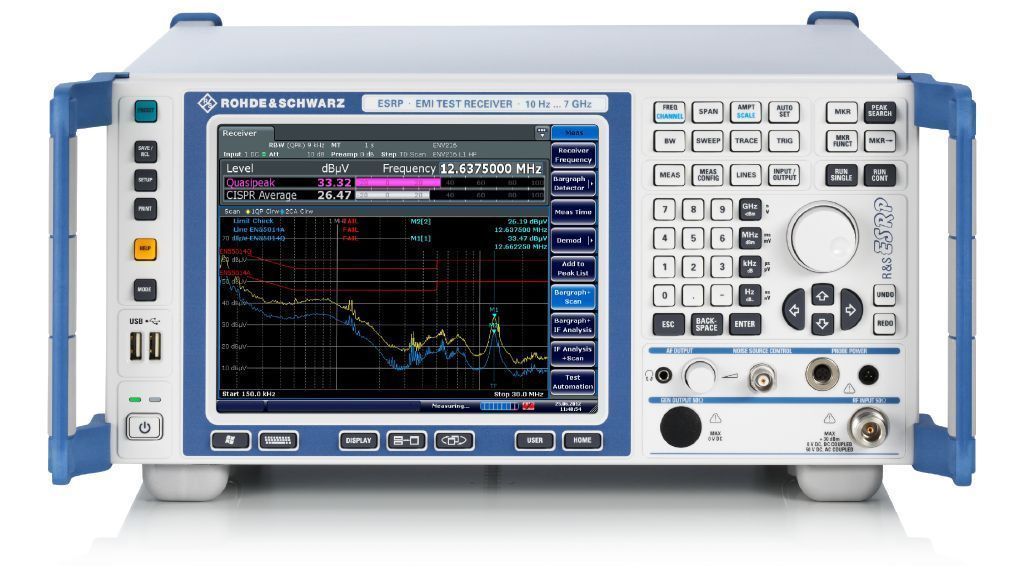 Прибор измеряет электромагнитные помехи в диапазоне частот от 10 Гц до 7 ГГц, используя традиционное пошаговое частотное сканирование или сканирование во временной области на основе БПФ, что значительно ускоряет измерения. R&S®ESRP может также выступать в качестве полнофункционального мощного анализатора спектра и сигналов для лабораторного применения. Благодаря сенсорному экрану и простой структуре меню прибором R&S®ESRP легко управлять в любом режиме.