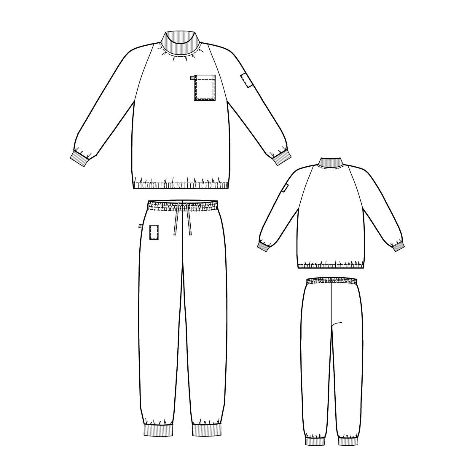 Костюм состоит из куртки и брюк. Костюм характеризуется отсутствием всех видов застежек.
