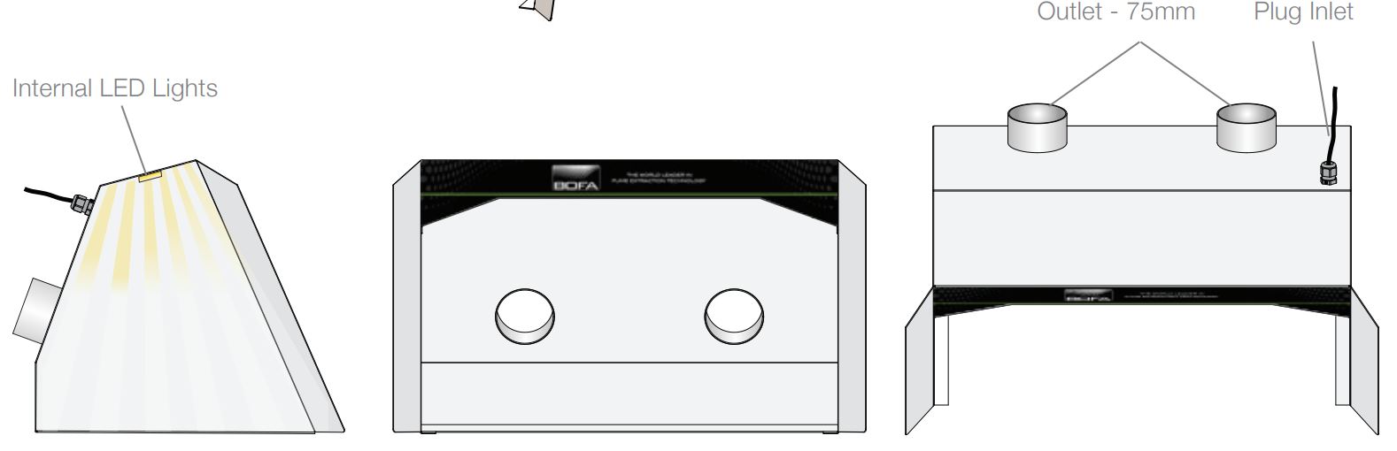Важной характеристикой является скорость потока воздуха, проходящего с лицевой стороны короба к воздуховодам в фильтрующий блок. Достаточной скоростью считается 0.5м/с, именно такая скорость не позволит вредным веществам вырваться наружу. BOFA представляет две модели вытяжных коробов с разными размерами для блоков фильтрации V250-GF и V600-GF.