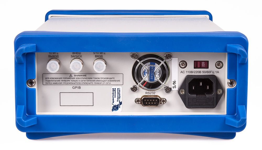 На задней панели частотомеров расположены разъем шнура сетевого питания, гарантийная пломба, выход опорного генератора, входы внешнего запуска и внешнего опорного генератора, а также наклейка с указанием используемой в частотомере опции опорного генератора.