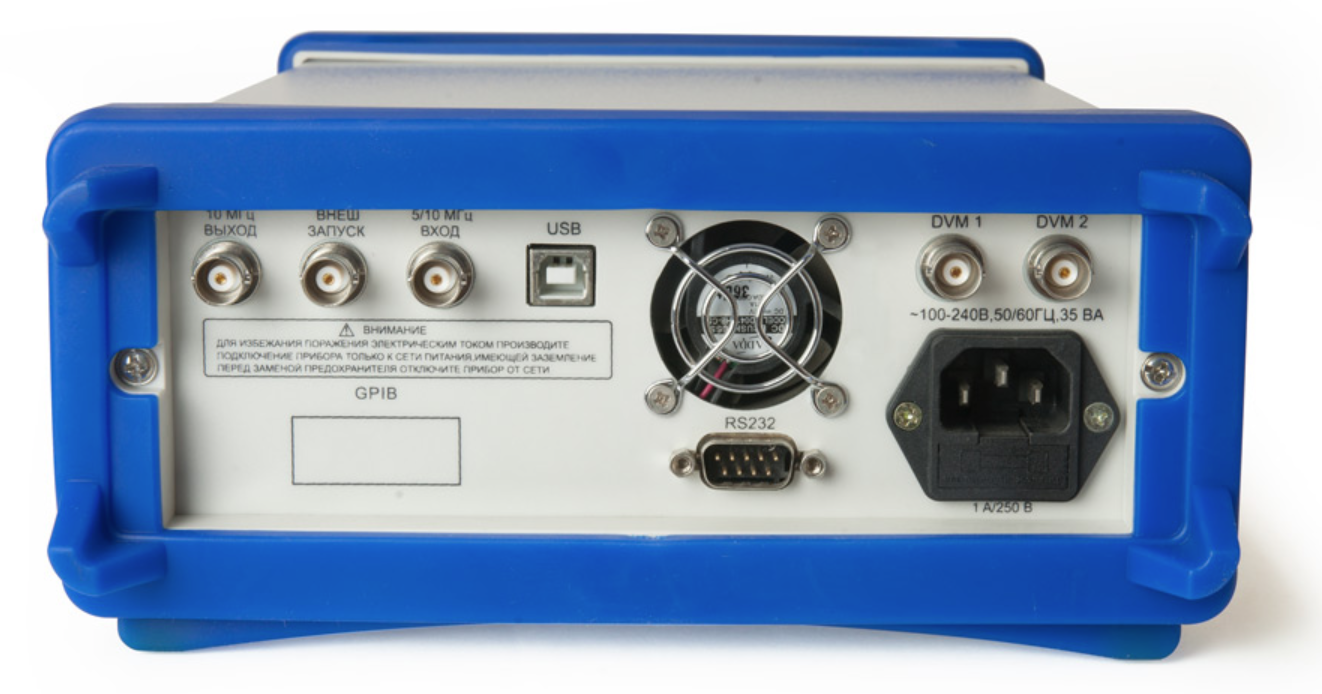 На задней панели частотомеров расположены разъем шнура сетевого питания, гарантийная пломба, выход опорного генератора, входы внешнего запуска и внешнего опорного генератора, а также наклейка с указанием используемой в частотомере опции опорного генератора.