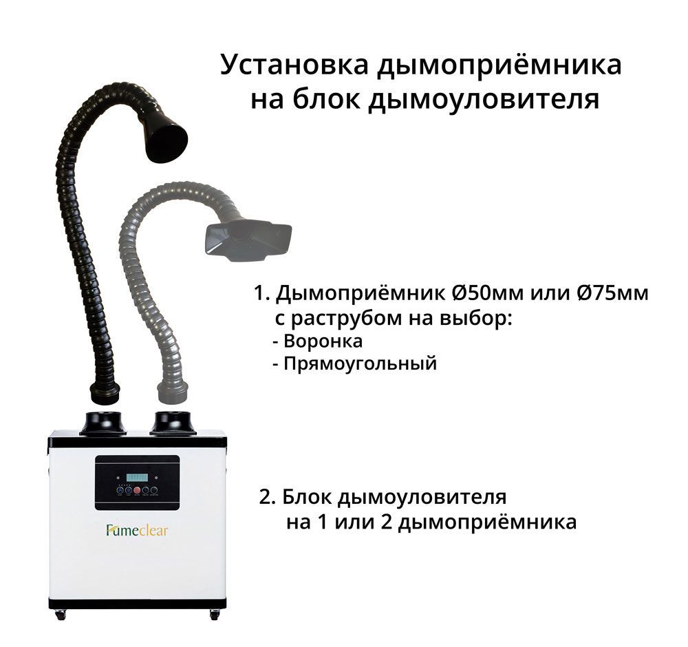 Дымоуловитель оснастили колесиками для легкого перемещения и встроенным шумогасителем. Так что пользоваться им будет комфортно и просто. Просто включите его в розетку, подсоедините дымоприемники и включите.