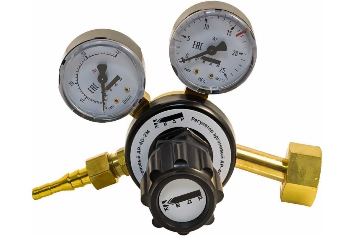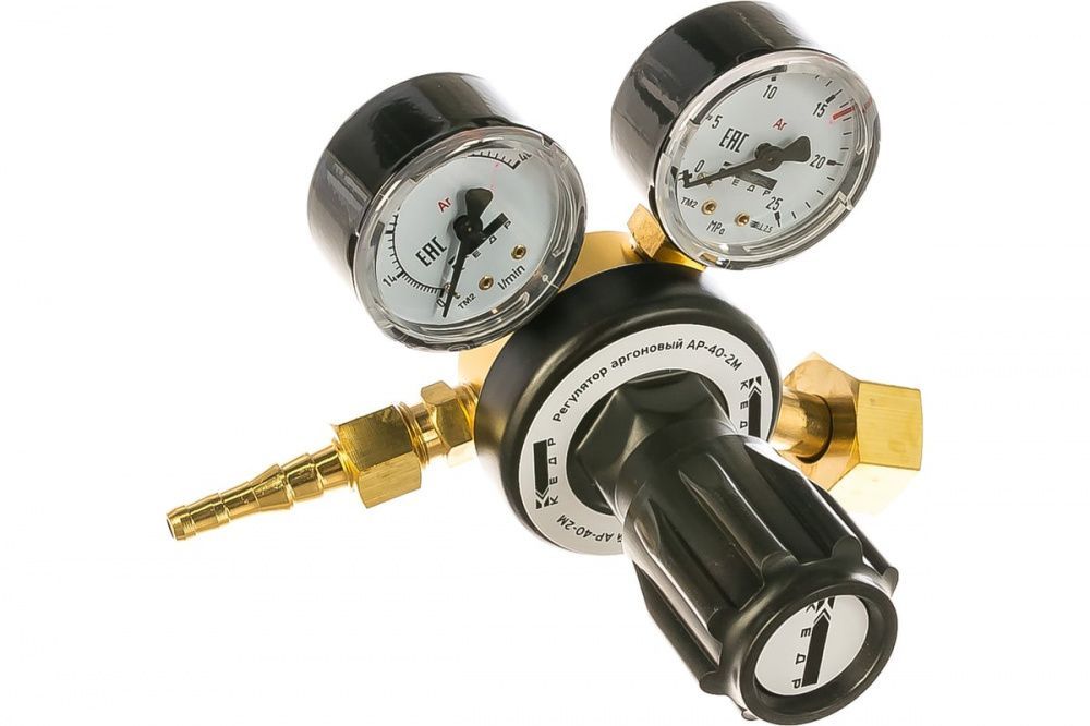 Регулятор аргоновый КЕДР АР-40-2М предназначен для понижения давления защитного газа, подаваемого из магистрали или баллона, и поддержания постоянного заданного расхода при питании постов сварочного оборудования для MIG/MAG и TIG-сварки.