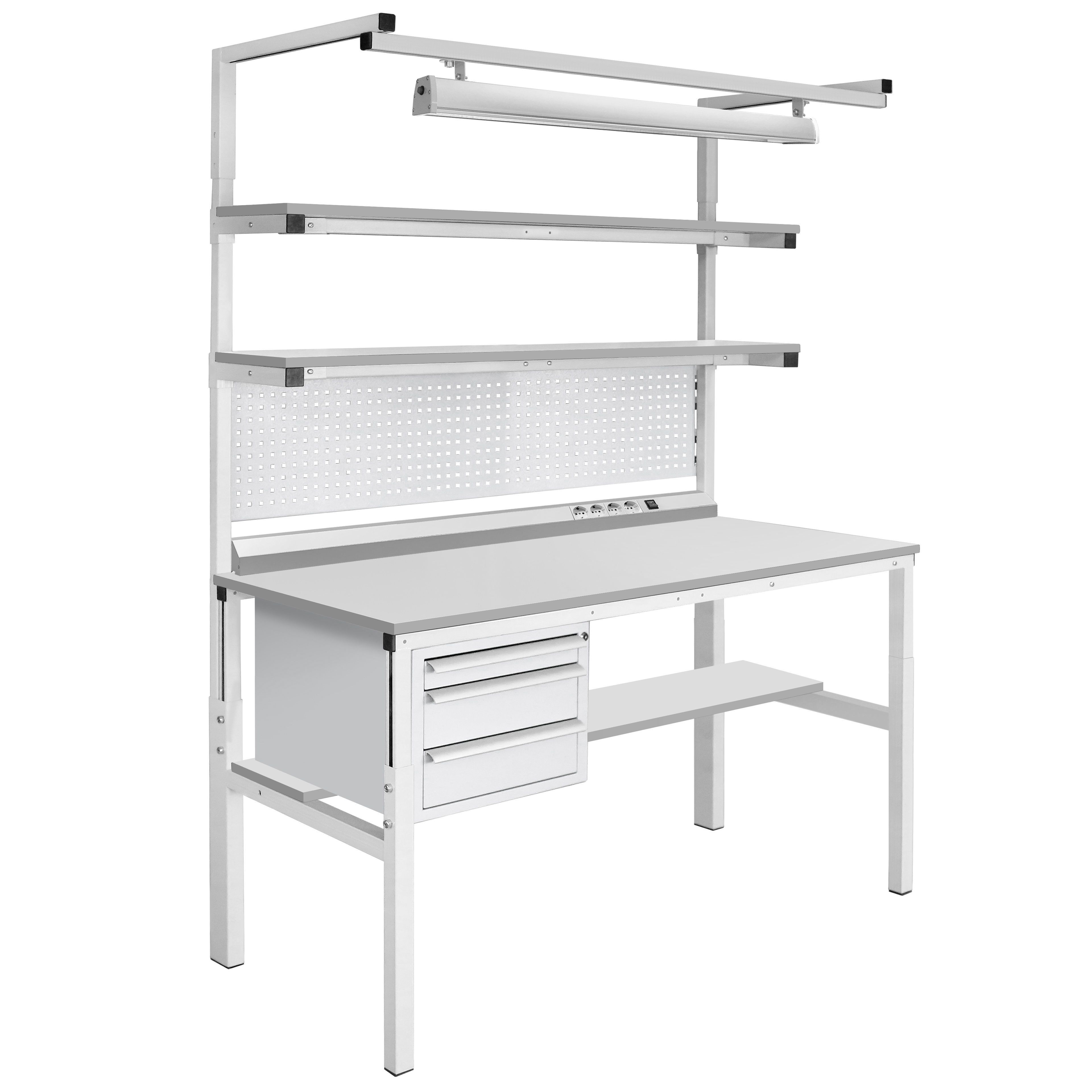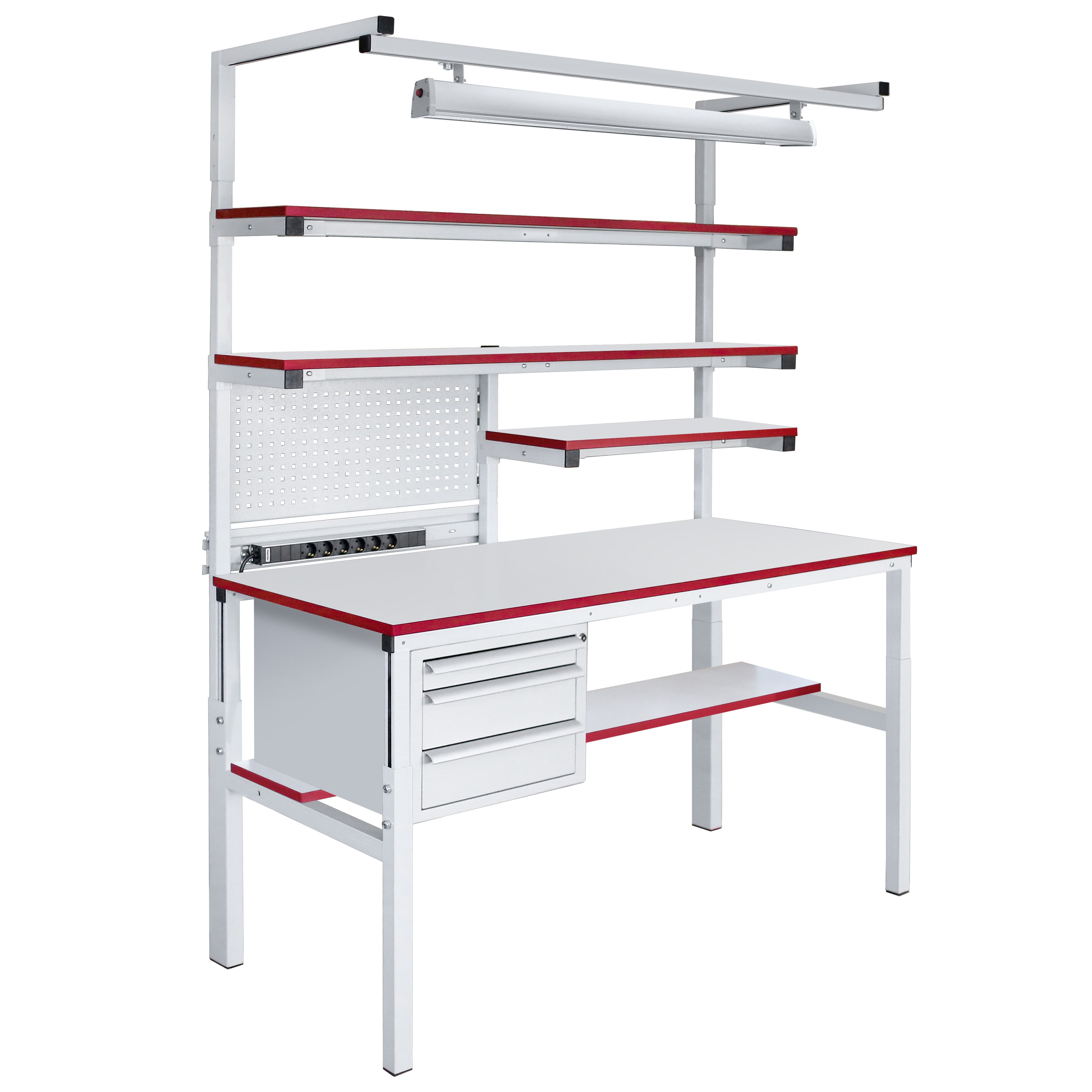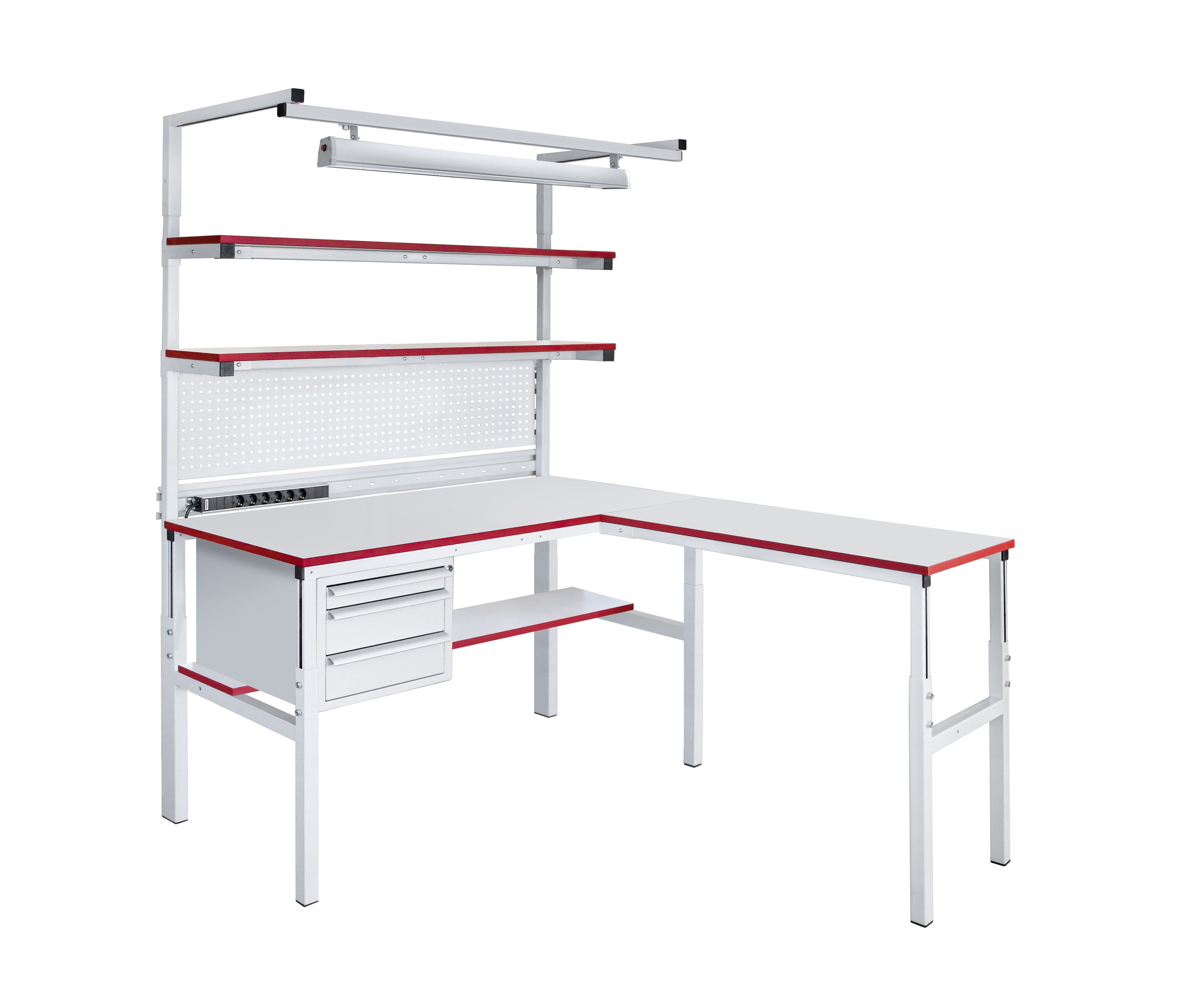 Модульная конструкция промышленного металлического стола дает возможность оснастить стол дополнительным оборудованием: подвесными тумбами, перфорированными панелями, электропанелями, планкой для крепления лотков, полками для приборов оборудования, полкой приборной нижней, освещением рабочей поверхности, угловым столом, крючками для инструментов и другим дополнительным оборудованием и оснащением.