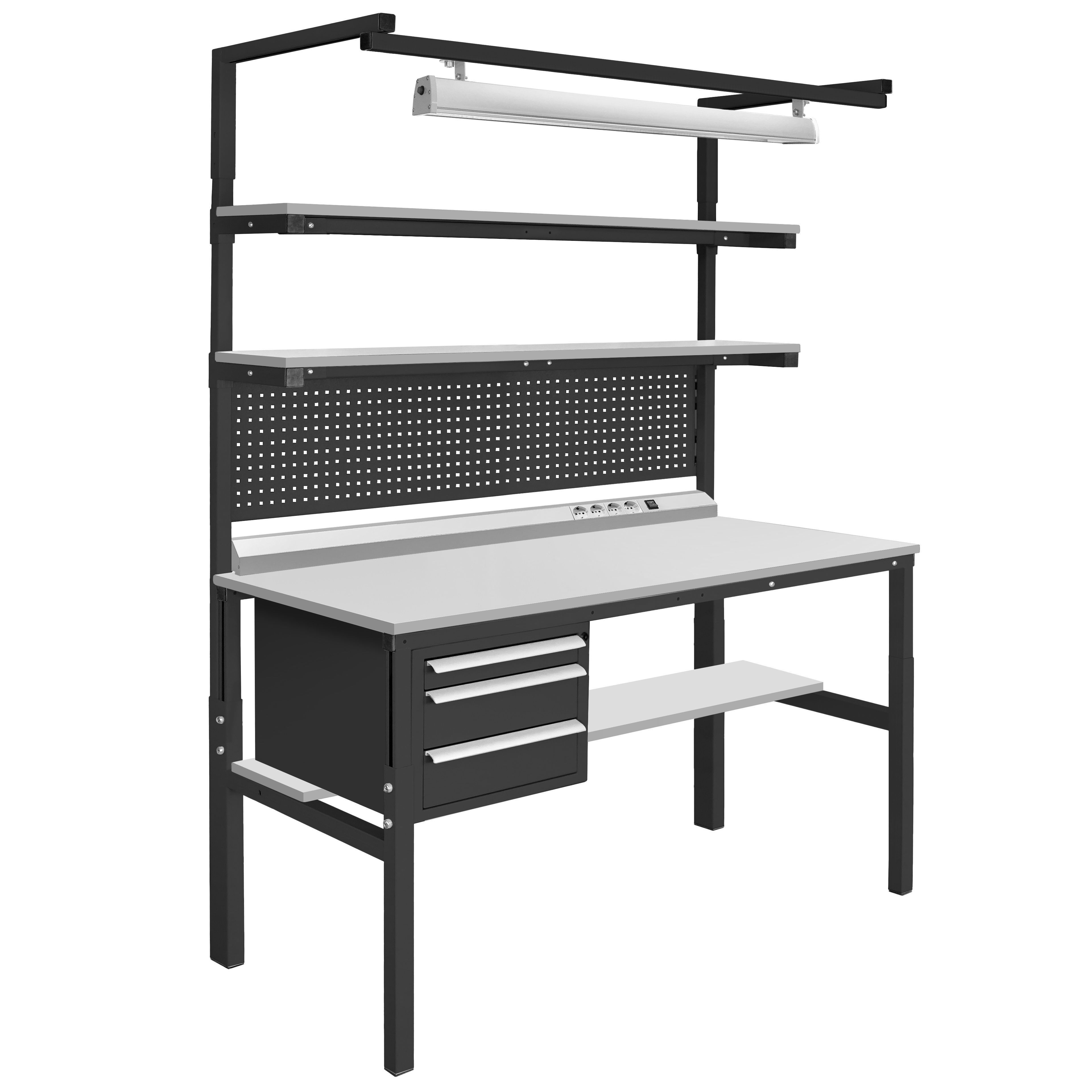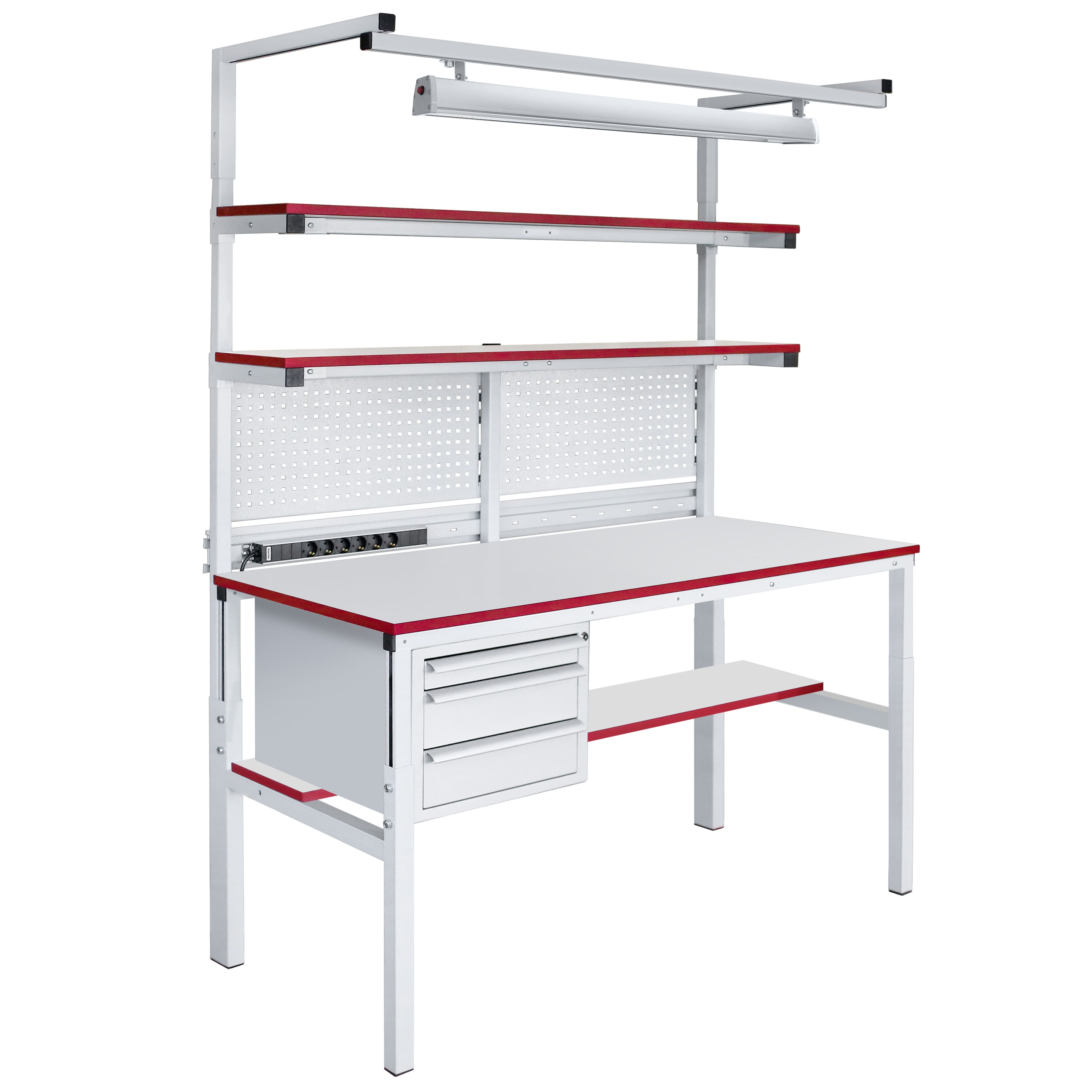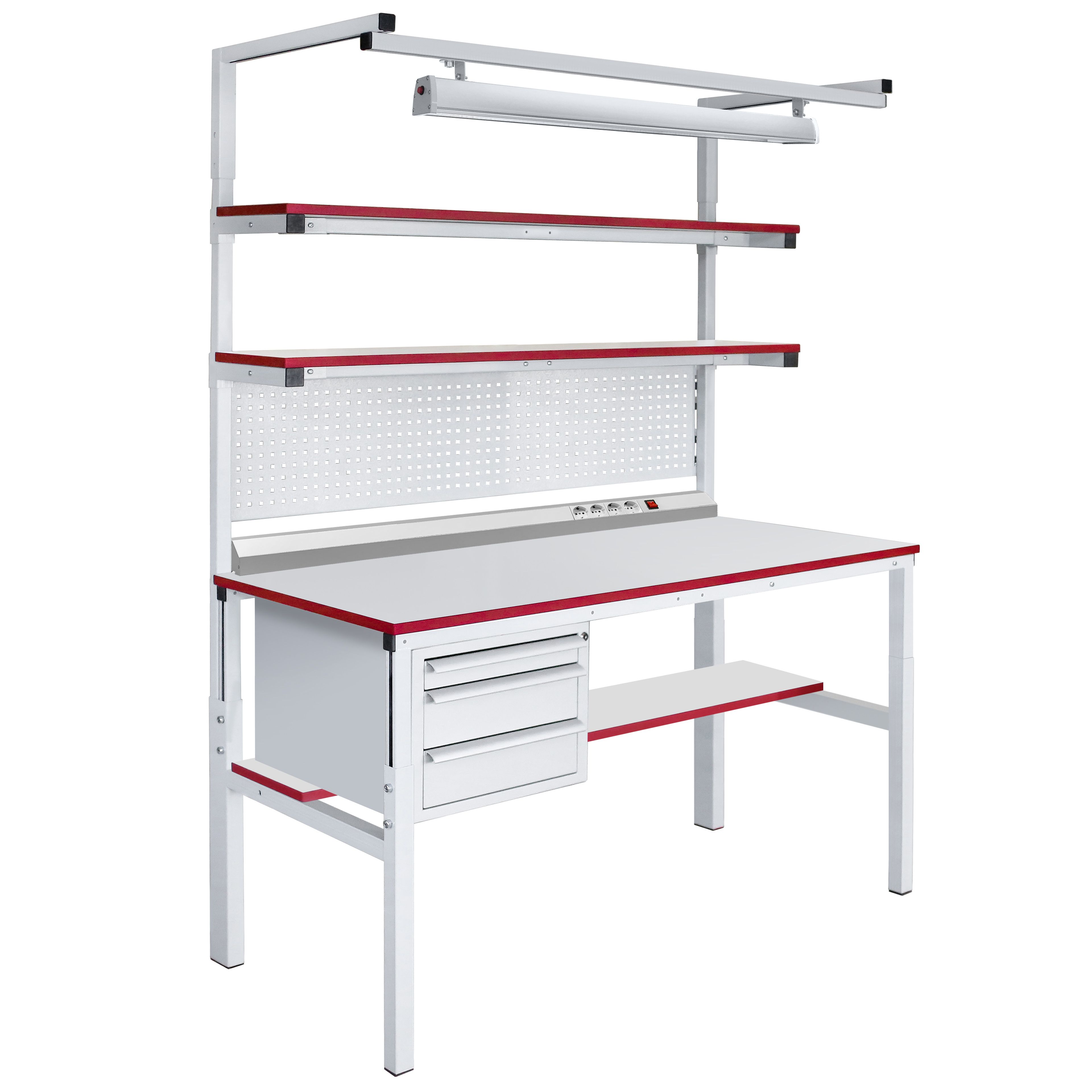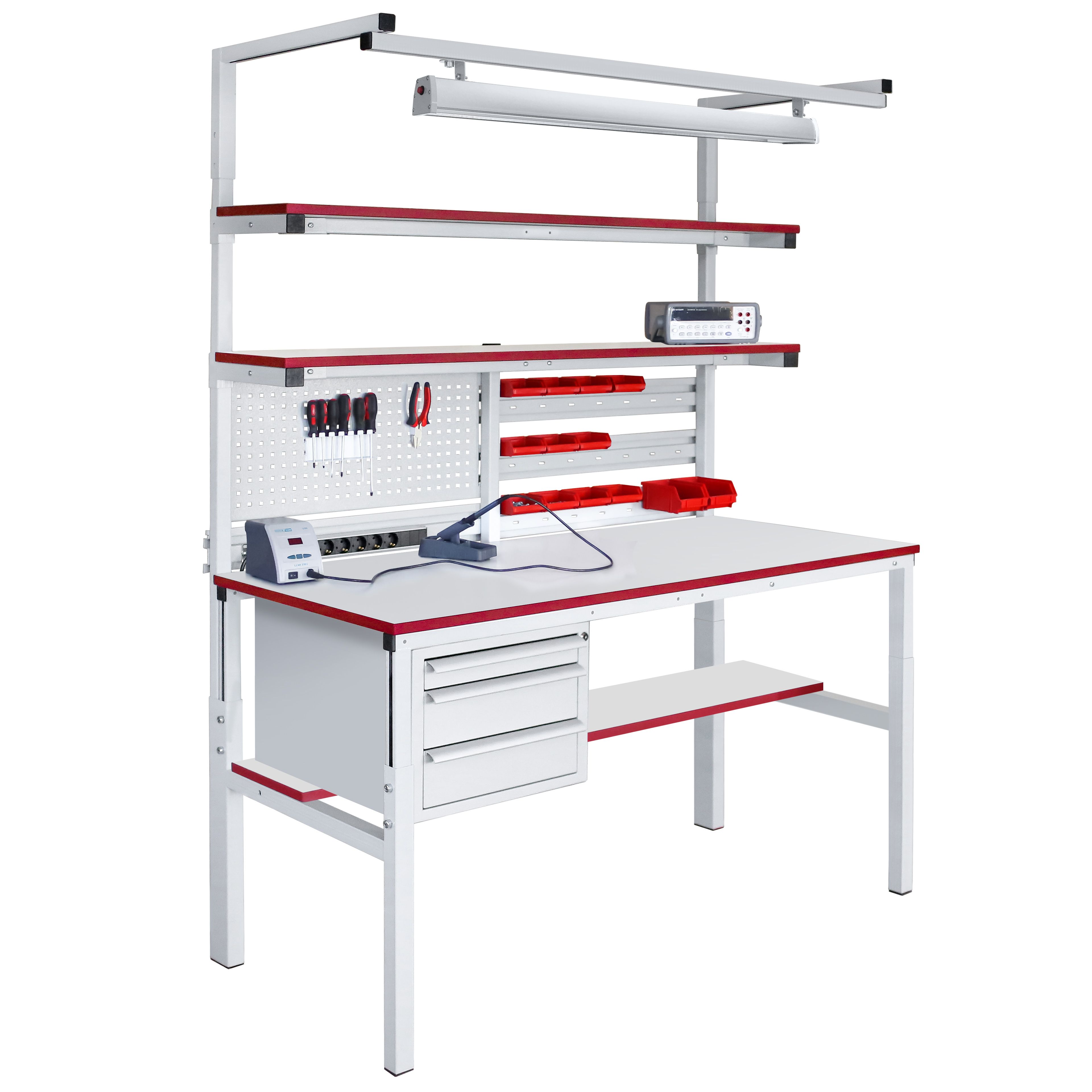 Модульная конструкция промышленного металлического стола дает возможность оснастить стол дополнительным оборудованием: подвесными тумбами, перфорированными панелями, электропанелями, планкой для крепления лотков, полками для приборов оборудования, полкой приборной нижней, освещением рабочей поверхности, угловым столом, крючками для инструментов и другим дополнительным оборудованием и оснащением.