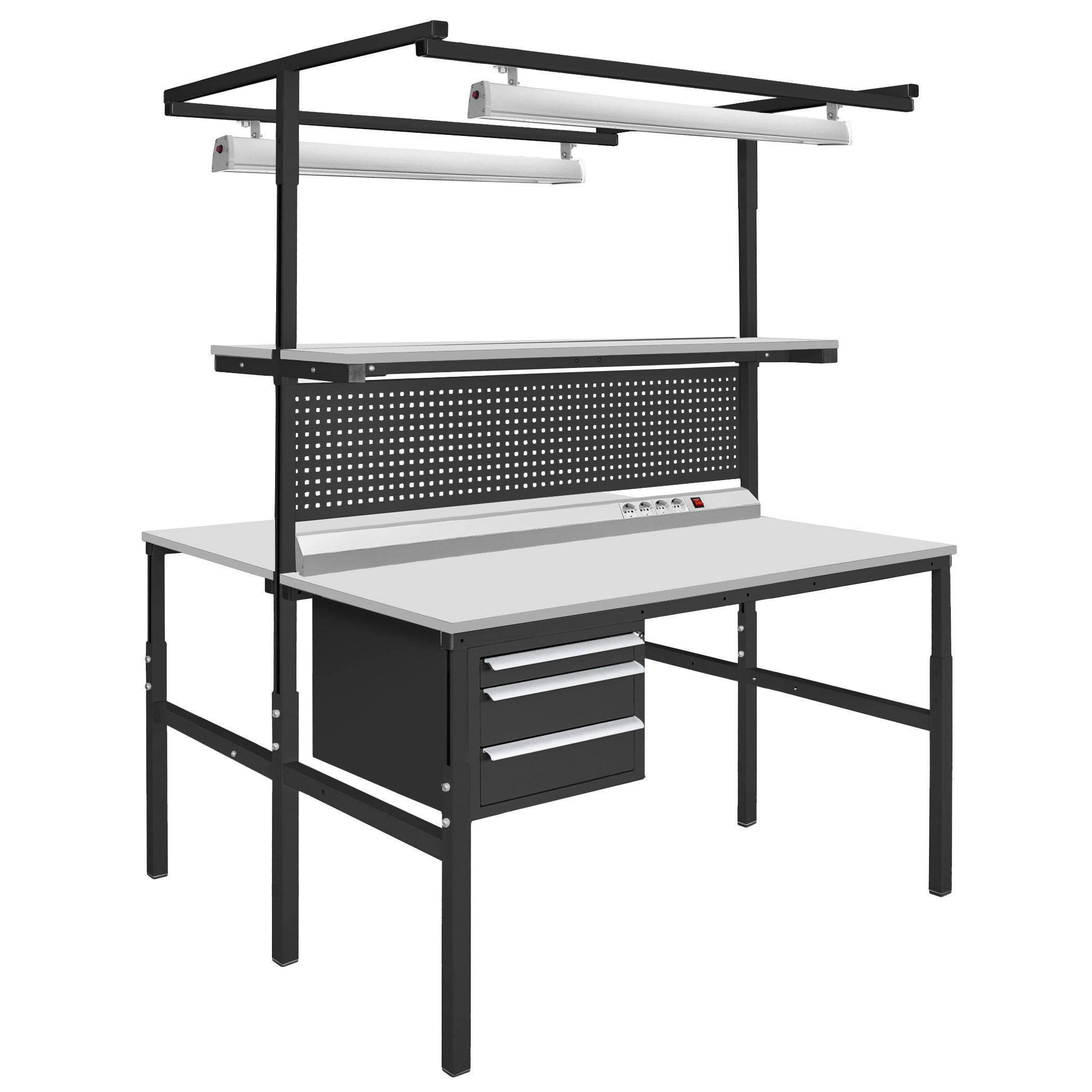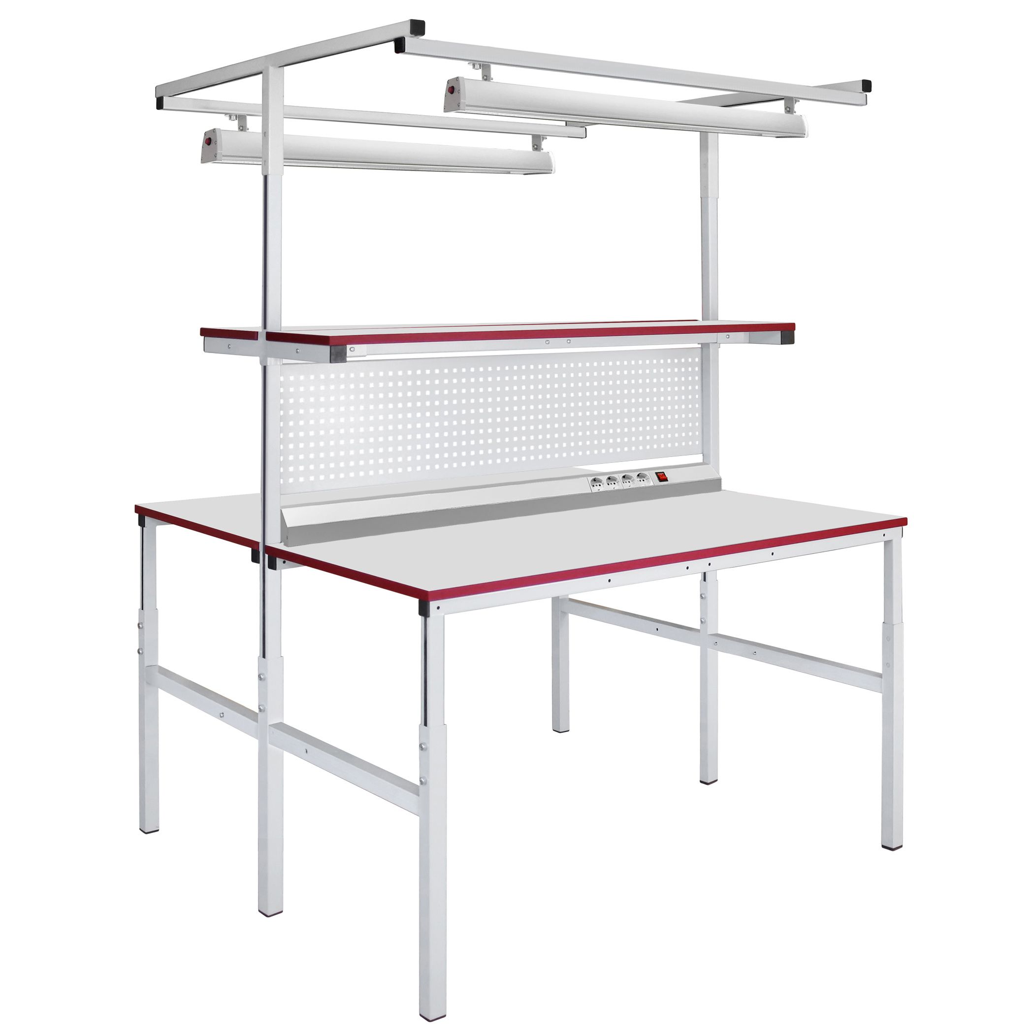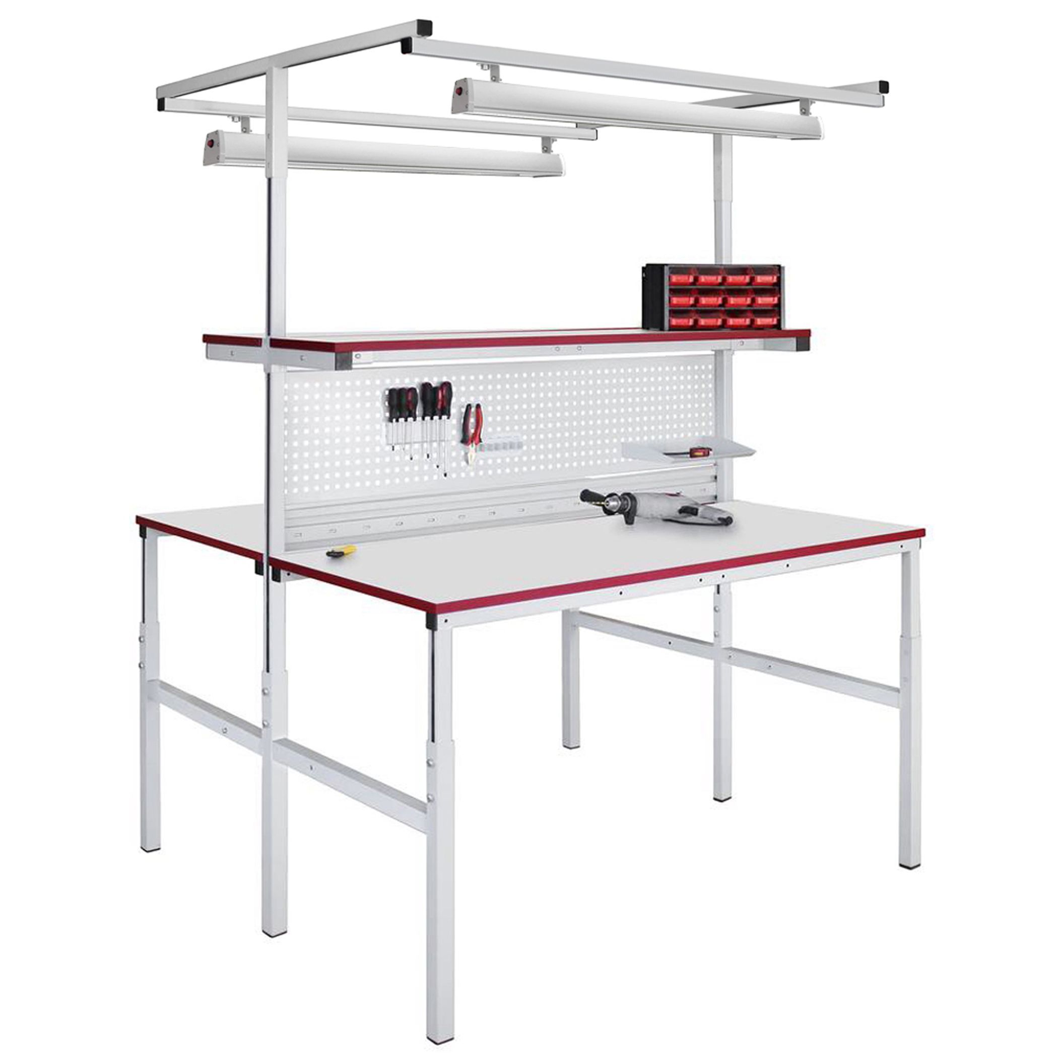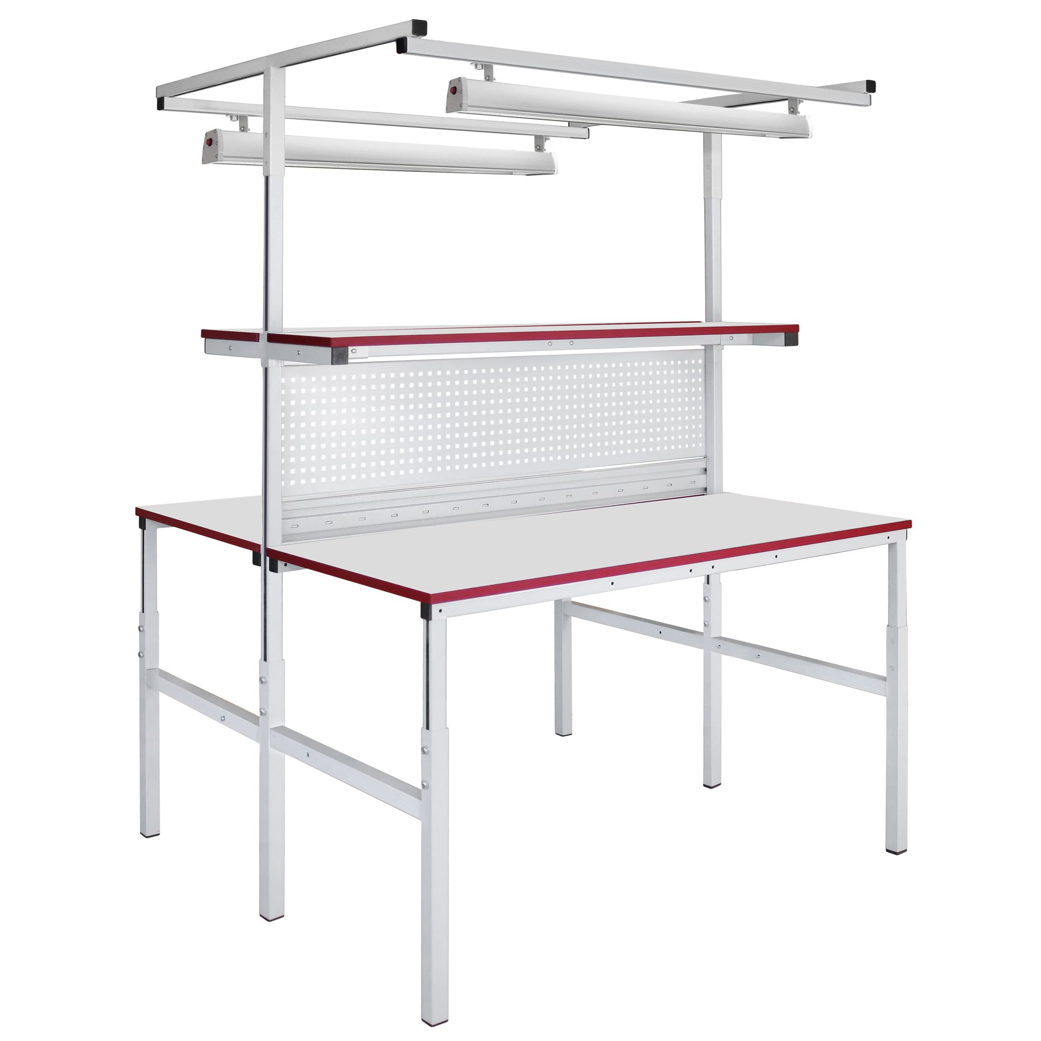 Модульная конструкция стола позволяет оснастить его дополнительным оборудованием: подвесными металлическими тумбами, перфорированными панелями, электропанелями, планками для крепления лотков, полками для приборов оборудования, освещением рабочей поверхности, угловыми столами и другим дополнительным оборудованием и оснащением.
