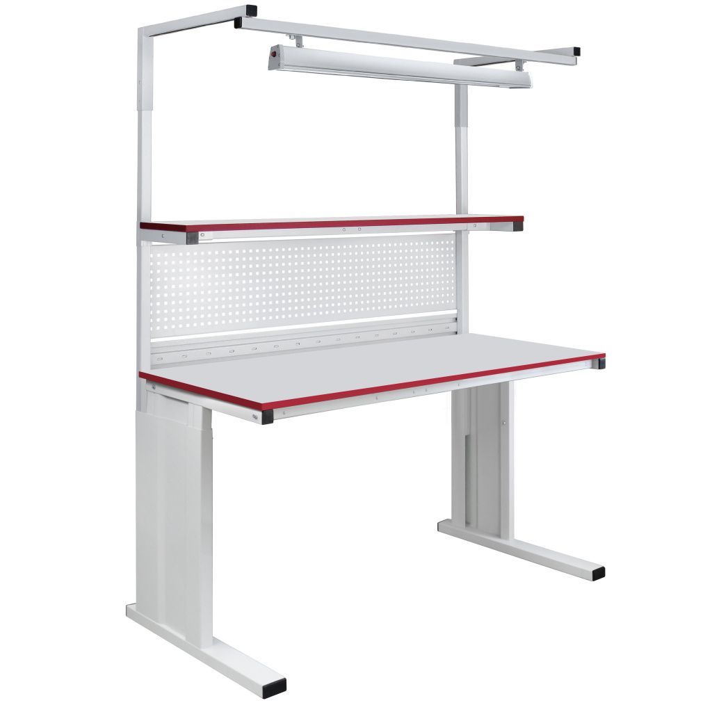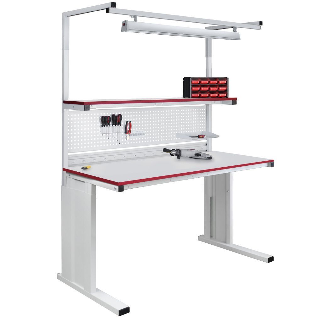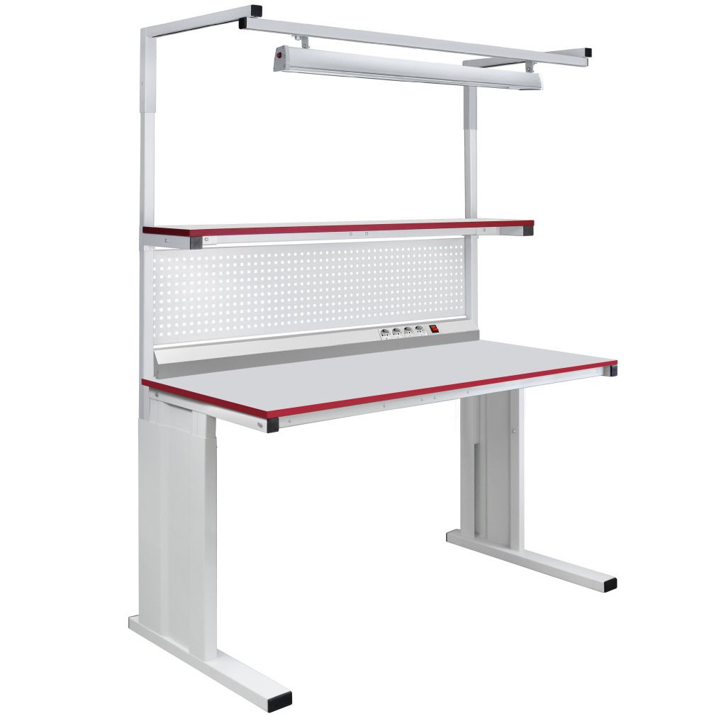 Металлический каркас стола выполнен из П-образного профиля, покрытого износостойкой порошковой краской светло-серого цвета RAL7035. Высота столешницы регулируется в пределах от 800 мм до 950 мм. Распределенная нагрузка на стол - до 200 кг. Конструкция стола позволяет оснастить его дополнительным оборудованием.