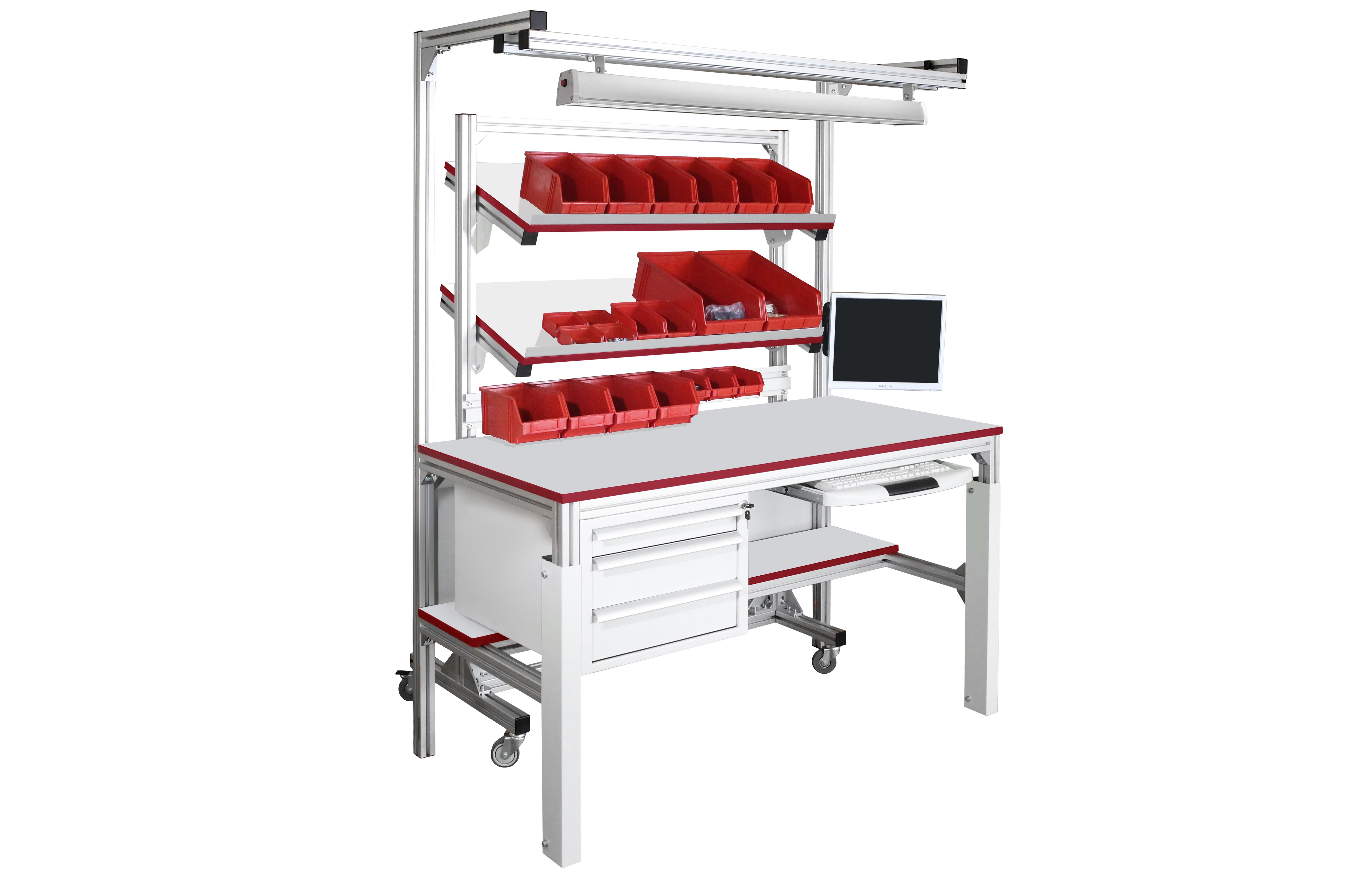 Каркас стола и стойки изготовлены из конструкционного профиля. Высота столешницы регулируется в пределах от 750 мм до 950 мм, что позволяет работать сидя и стоя. Распределенная нагрузка на стол — до 300 кг. Конструкция стола позволяет оснастить его дополнительным оборудованием и интегрировать с конвейерами, рольгангами и другими конструкциями и системами.