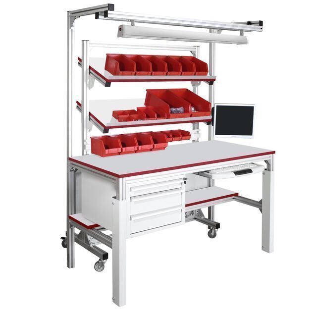 Каркас стола и стойки изготовлены из конструкционного профиля. Высота столешницы регулируется в пределах от 750 мм до 950 мм, что позволяет работать сидя и стоя. Распределенная нагрузка на стол — до 300 кг. Конструкция стола позволяет оснастить его дополнительным оборудованием и интегрировать с конвейерами, рольгангами и другими конструкциями и системами.