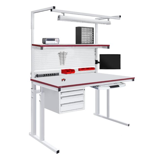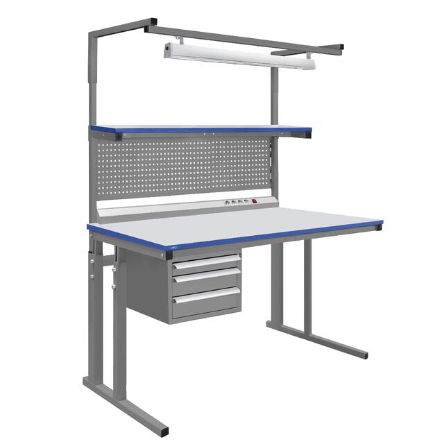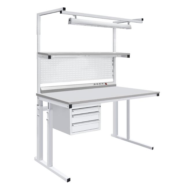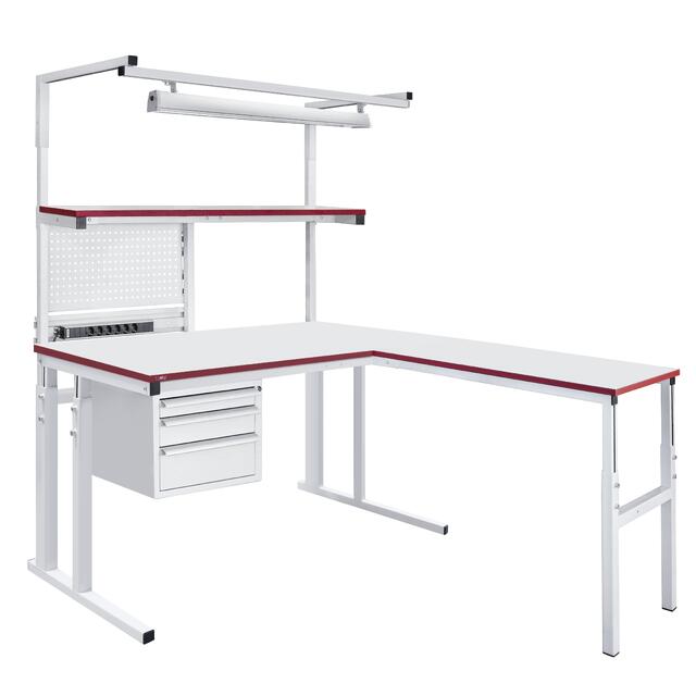 Модульная конструкция промышленного металлического стола дает возможность оснастить стол дополнительным оборудованием: подвесными тумбами, перфорированными панелями, электропанелями, планкой для крепления лотков, полками для приборов оборудования, полкой приборной нижней, освещением рабочей поверхности, угловым столом, крючками для инструментов и другим дополнительным оборудованием и оснащением.
