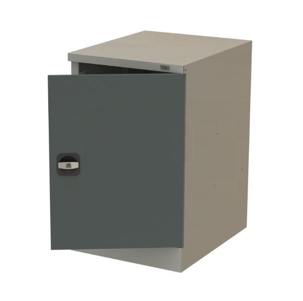 Металлическая стационарная тумба с дверцей для организации хранения.