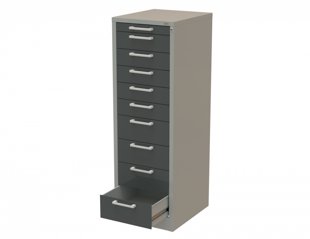 Имеет десять выдвижных ящиков с механизмом легкого скольжения, которые выдвигаются на 550 мм.